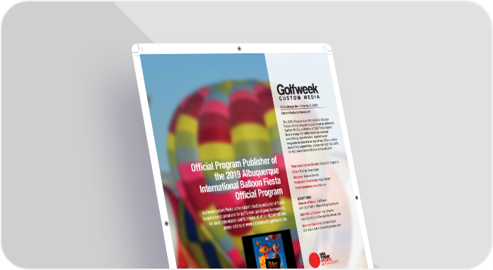 633 N. Orange Ave. • Orlando, FL 32801 CustomMedia.Golfweek.com The 2019 Albuquerque International Balloon Fiesta official program is published by Golfweek Custom Media, a division of USA Today Sports Media Group. For information on national advertising opportunities, special event magazine production or any of our other custom publishing capabilities, please call 407.563.7012 Offi cial Program Publisher of or visit www.CustomMedia.Golfweek.com the 2019 Albuquerque Publisher/Creative Director: Michael C. Hagmann Editor: Michael Shamburger International Balloon Fiesta Designer: Andrew Dietrich Production Coordinator: Gabi Weaver Offi cial Program Print Coordinator: Anna Murray Golfweek Custom Media is the nation’s leading publisher of highly ADVERTISING targeted event programs for golf’s most prestigious tournaments. Director of Sales: Ted Mersch For more information and to browse all of our digital editions, 407-563-7045 • TMersch@golfweek.com please visit us at www.custommedia.golfweek.com. Advertising Director: Eric Smooke 407-563-7010 • ESmooke@golfweek.com Account Executive: Candace Davis 239-292-4418 • CDavis@golfweek.com USA Today Sports Media Group Chris Pirrone, VP & General Manager Patrick Leahy, Associate Publisher – Golfweek and VP of Revenue – USA TODAY Golf