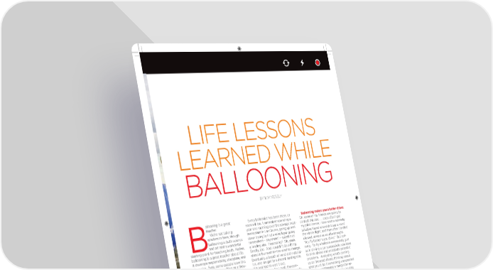 LIFE LESSONS LEARNED WHILE BALLOONING BY KIM VESELY allooning is a great ƒvery balloonist has been there, or Ballooning makes yo a bette ie. teacher. soon will be. I remember spending a Žh, some of my friends are going to We’re not talking year one morning over the sewage treat contest this one . . . soon after I got academics here, though ment plant in ˆas ‰ruces, going up and my pilot license, I took aloft a normally ballooning is both science down trying to find a wind layer going talkative friend who didn’t say a word B and art and a wonderful somewhere – anywhereŠ suitable as the whole flight, and then after I landed starting point for teaching both. Rather, a landing site. ‹rustratingŒ Žh, yeah. allowed, almost as an afterthought‚ ballooning is a great teacher about life. Smelly, too. ‘nd I couldn’t do a thing “–ou fly better’n you drive.” But seri It develops responsibility, discipline, and about it but wait for the wind to change. ously. šo fly a balloon successfully, ust character. Sure, some people learn this ƒventually, a breath of wind did material as in driving a car successfully, you have i’e, and we got to a decent landing site. to think ahead and anticipate potential stuff hang gliding or uilting or a thou sand other noble pursuits. But there’s We ust had to wait it out. problems. ‘naly’ing what’s coming nothing uite like having to problem ‘s astronaut “im ˆovell, the com up on the road ahead, thinking about solve a thousand feet in the air – you’d mander of the troubleplagued ‘pollo what you’d do if something une›pected better figure it out ‘cause it’s a long way ”III flight, famously noted, you can panic happens, and leaving a margin for er down. and bounce off the walls, but in the end ror minimi’es the potential for trouble ere are ust a few of the lessons you’ll be right back where you started – behind the wheel and in the air. „Žf and you still have to solve the problem. course – here’s the knockonwood line learned over € years pursuing balloon ing on the ground and in the air‚ So you might as well be patient. – behind the wheel and in the air even if Ballooning teaches patience. In a Ballooning teaches flexibility. ˆike you leave that margin for error, some balloon, you go where the wind goes. all aviators, balloon pilots launch with a times stuff happens. ‰runch.‡ ƒnd of story. It’s true you can go up and flight plan‚ launch here, fly for an hour Ballooning teaches yo to leae a down to find winds going different di in this direction „or directions‡, and land magin o eo ‘bout that margin rections and speeds at different altitudes there. –ou take off, and—voilàŠ halfway for error – it’s one of life’s most valuable „in a balloon, it’s how the pilot “steers”‡. through the flight the wind direction lessons. In driving, it means not follow But no matter how much you wish the changes. So much for the flight plan. So ing too closely. In ballooning, it means balloon would go this way, if the wind’s you’d better have a plan B, and ‰, and ™ leaving enough room when you land so going that way, it is what it is and you’re . . . because what goes up must come if the wind changes direction suddenly, stuck with it. down somewhere. you don’t get pushed into something 83 PICTURE PERFECT