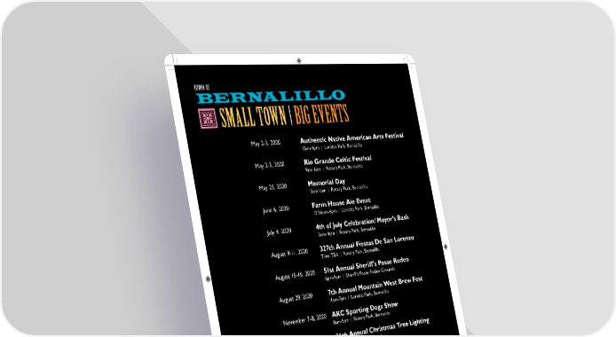 TOWN OF BERNALILLO SMALL TOWN | BIG EVENTS May 2-3, 2020 Authentic Native American Arts Festival 10am-6pm | Loretto Park, Bernalillo May 2-3, 2020 Rio Grande Celtic Festival 9am-6pm | Rotary Park, Bernalillo May 25, 2020 Memorial Day 11am-1pm | Rotary Park, Bernalillo June 6, 2020 Farm House Ale Event 12 Noon-6pm | Loretto Park, Bernalillo July 4, 2020 4th of July Celebration / Mayor’s Bash 11am-4pm | Rotary Park, Bernalillo August 9-11, 2020 327th Annual Fiestas De San Lorenzo Time TBA | Rotary Park, Bernalillo August 15-16, 2020 51st Annual Sheriff's Posse Rodeo 6pm-9pm | Sheriff’s Posse Rodeo Grounds August 29, 2020 7th Annual Mountain West Brew Fest 11am-7pm | Loretto Park, Bernalillo November 7-8, 2020 AKC Sporting Dogs Show 8am-5pm | Rotary Park, Bernalillo December 4, 2020 36th Annual Christmas Tree Lighting 6pm | Bernalillo Town Hall December 5, 2020 36th Annual Nighttime Christmas Parade 6:30pm-8pm | Camino del Pueblo, Town of Bernalillo www.townofbernalillo.org