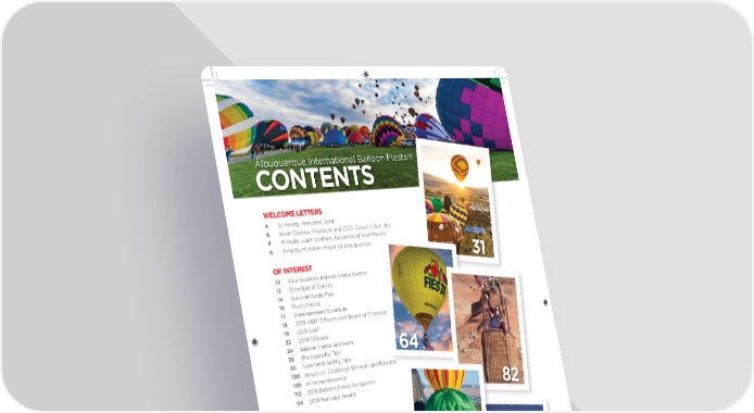 Albuquerque International Balloon Fiesta® CONTENTS WELCOME LETTERS 4 Ty oung Presient AIBF 6 ein Ogaa Presient an OO anon €‚€A€ Inc€ 8 ƒic„elle …u†an ‡ris„am ‡oernor of ˆe ƒe‰ico 9 Timot„y ƒ€ eller ƒayor of Albuquerque 31 OF INTEREST 10 our ‡uie to Balloon Fiesta Šents 12 ‚c„eule of Šents 14 ‚urial ‡uie ƒa‹ 16 ƒusic Fiesta 17 Šntertainment ‚c„eule 18 2019 AIBF Offi cers an Boar of Œirectors 19 2019 ‚taff 22 2019 Offi cials 24 Balloon Fiesta ‚‹onsors 28 P„otogra‹„y Ti‹s 64 30 ‚‹ectator ‚afety Ti‹s 100 America’s „allenge ‘inners an ’ecors 108 In ’ememberance 112 201“ Balloon Fiesta ˆaigators 114 201“ ”eritage Aar 82 DIRECTORIES 31 2019 AIBF Balloon Œirectory 62 Ot„er Partici‹ating Pilots 89 ‚‹ecial ‚„a‹e Œirectory 96 International Pilots 98 ‡as Pilots FEATURES 64 T„e “Fiesta” Balloons 70 T„e Iris„ Balloonist Blessing 89 74 Braning Balloon Fiesta 78 ‡etting T„ere is ”alf t„e “Fun” 82 …ife …essons …earne ‘„ile Ballooning 102 ’eriting t„e ’ecor Boo—˜ T„e Š‹ic 201™ America’s „allenge 98 Albuquerque International Balloon Fiesta 2019 Offi cial Program 2 ®