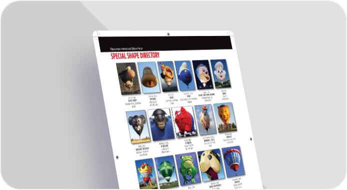 Albuƒuerƒue nternational Balloon ‡iesta® SPECIAL SHAPE DIRECTORY Ary, George Aston, Greg Assis, uiz Audenaert, „oen August, ‚oe Baker, Bill BLACK SHEEP MISS BELL SAXON SMURF ROCKET, THE FLYING SQUIRREL BIMBO Ribeirão Preto, São Paulo eridian, D São Paulo, São Paulo Destelbergen, †ostˆ‰laanderen e€ort Bea, CA Tyler, TX Brazil United States Brazil Belgiu United States United States Baker, Dave Ballinger, Barry Berry, „eit Boniontro, aros Bonner, Paul ADELAIDE THE KOALA IN THE BUFF SPYDERPIG ARMADILLO (TATU) SIMBALOO Tata, Berksire ubbok, TX Po€lar Blu……, † São Paulo, São Paulo Basingstoke, Ša€sire Great Britain United States United States Brazil Great Britain Boulet, ark Boyer, Don Bron, Toby Burros, Paul Ca€anale, ‡rank PIRATE JACK ITSY BITSY KERMIE BUSTER THE BULLDOG CAROUSEL e€ort Bea, CA Belen, Denver, C† Bristol, Banes †rard ake, United States United States United States Great Britain United States Carlton, Dean Cassell, ‚aes Cavin, ‚on Celentano, iael Cesnik, uke WAGZ BEAGLE MAXIMUS YELLOW BIRD ANNIE THE LADYBUG FREEDOM FLIGHT V Danville, Albuƒuerƒue, ndialanti, ‡ Allen, TX Saint Cloud, United States United States United States United States United States Albuquerque International Balloon Fiesta 2019 Offi cial Program 90 ®