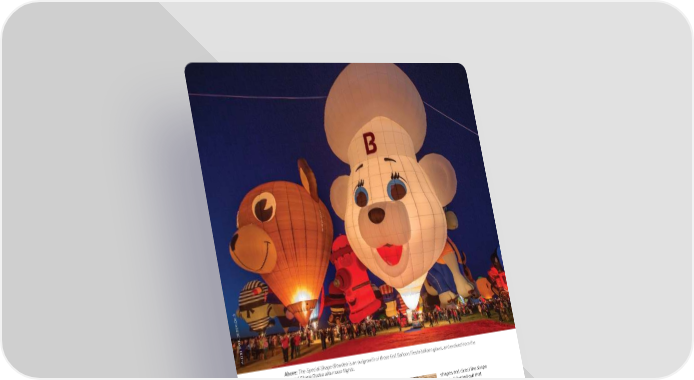JOEIS DEBER UL A O: P T PHO Above: The Special Shape Glowdeo is an outgrowth of those first Balloon Fiesta balloon glows, and evolved from the Special Shape Rodeo afternoon flights. shapes flying in the mid- shapes and direct the shape O 1980s. If you wanted one of T event. It turned out that these shapes to appear at PHO I directed the first seven A your event, you had to pay T years of the Special Shape S the pilot to put it up. Our Rodeo, helped negotiate all best selling point was to tell OON FIE the shape contracts, and the pilots this would be the ALL flew a special shape in all largest gathering of shapes B the events. in the world and being part Another problem was of it was something they OFFICIAL that the Balloon Fiesta should not miss. charged a commercial fee During these early years for any balloon displaying a of the Balloon Fiesta, corporate logo. I soon found members of the Board did out to get any commercial a lot of the ground level work to make the Balloon shapes we needed to waive these fees. The board Fiesta successful. This included Board members agreed to waive the commercial entry fees, but taking on key flying event official duties, preparing only for the events on Thursday and Friday evening. the field, preparing pilot packs, registration and a Commercial shapes still had to pay if they wanted to hundred other things. My job was to recruit special fly during the daytime events. ® 142 Albuquerque International Balloon Fiesta