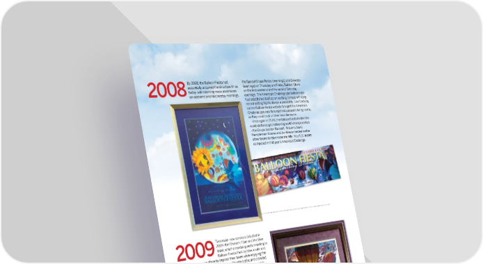 By 2008, the Balloon Fiesta had the Special Shape Rodeo (mornings) and Glowdeo essentially acquired the structure it has (evenings) on Thursday and Friday, Balloon Glows 2008today, with morning mass ascensions on the fi rst weekend and the second Saturday on weekend and Wednesday mornings, evenings. The America’s Challenge gas balloon race had established itself as an exciting contest with long, record setting fl ights always a possibility. Live tracking via the Balloon Fiesta website brought the America’s Challenge gas race fans right into people’s living rooms, so they could root on their favorite teams. Once again in 2008, the Balloon Fiesta hosted the world distance gas ballooning world championships - the Coupe Gordon Bennett. Britain’s David Hempleman-Adams and Jon Mason bested twelve other teams to take home the title. Four U.S. teams competed in that year’s America’s Challenge. Two major new services debuted in 2009: the Chasers’ Club and the Bike 2009Valet, which provides guests traveling to Balloon Fiesta Park by bike a safe and secure place to deposit their bikes while enjoying the Balloon Fiesta. (It helps alleviate traffi c and crowded parking lots, too.) The Balloon Fiesta continued to centralize services for guests, bringing group tour services in house, as it had Park and Ride and hotel bookings for pilots. Weather can always be a challenge for the Balloon Fiesta, and in 2009 it proved problematic for the America’s Challenge. The balloons were infl ated on the fi eld ready to take off when a low level jet stream brought high winds across the fi eld. After a two hour hold, the race was cancelled, since it was not safe to launch. OFFICIAL PROGRAM 207