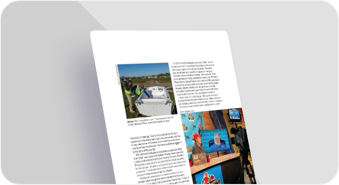 A In 2020 COVID challenged everyone. After months ANT of back and forth, the decision to postpone the actual B OR event was made in the interest of safety. Everyone T was devastated and couldn’t imagine surviving an O: VIC October without a Balloon Fiesta. The solution? Offer T a virtual Balloon Fiesta, via Balloon Fiesta Live! Windfire PHO Productions had just taken over control of Albuquerque’s community access cable channels, which set the stage, literally. Balloon Fiesta Live! set up shop in a newly renovated studio to produce 14 live streams, timed to what would have been the actual event sessions. It was quite an undertaking. Lloyd produced and anchored from the set in Albuquerque. Moyer and his cat, Ranger, joined via Zoom from his home in Louisiana. The team showed edited video highlights from past PHOTO: BOBBIE TULEY Above: The “competition cam”: Lloyd explains the Sid Cutter Memorial Task, where the target is a boat. America’s Challenge. Due to the uncertainty of how it would work, the live stream was not announced until the Friday before the 2016 event. And while the production had some technical issues, the online audience logged in by the tens of thousands. With all the knowledge and experience gained in that first “pilot” year, Lloyd and Balloon Fiesta made plans for a truly professional experience moving forward. Windfire Productions was hired to provide the technical expertise for the stream. Graphics and a show open and close were produced. A dedicated line to the internet was added to ensure the live stream would be reliable. Additional cameras and a master control room in a trailer were brought on site to handle the show and stream. Once again, the shows drew thousands. In fact, it was calculated that as many people tuned in to watch as showed up on the field that year. The next year, an additional camera was added to allow for video from the basket of a balloon. Ruth Lind, a hot air and gas balloonist and former editor of the national publication Ballooning, and Kim Vesely joined the team as reporters. Both usually work the America’s Challenge Gas Balloon Event, but with no event in 2018, they needed something to do. They proved to be a huge asset Above: Balloon Fiesta Live! pandemic edition: Lloyd in to the on-air team. Albuquerque, and Moyer in Louisiana In 2019, Balloon Fiesta Live! expanded its reach by adding a low power TV station. In addition to streaming live on Balloon Fiesta’s website, YouTube and Facebook, Balloon Fiestas. Just like during a live event, guests people with an over-the-air antenna within about 4 miles joined in, either in person or via Zoom. The team also of the Balloon Fiesta Park could now watch on their tapped into the opportunity created by the “Lifting Spirits television. This allowed RVers and hospitality tents to Around the World,” movement, where balloonists flew in install TVs to watch Balloon Fiesta Live!, instead of just their hometowns during Balloon Fiesta week to thank listening to the PA speakers. Coverage of competition got first responders. Pictures and tapes and even live video a boost by putting Lloyd and a camera crew in the middle were brought into the show of balloon flights and events of the competition field, so viewers got a close up look around the world. and listen to balloons coming into the target. At one point, Moyer and Lloyd counted down an OFFICIAL PROGRAM 243