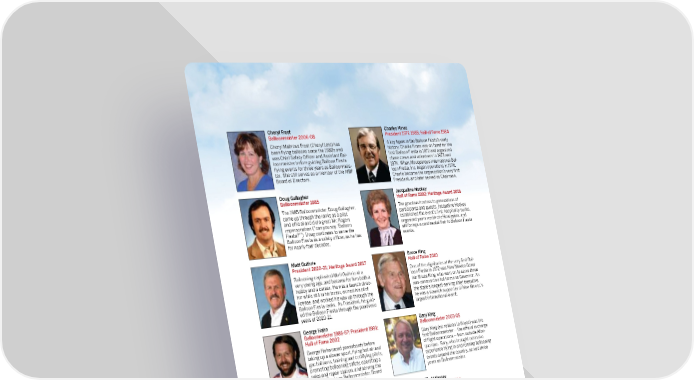 Cheryl Frost Charles Hines Balloonmeister 2006-08 President 1977, 1985; Hall of Fame 1984 Cheryl Mathews Frost (Cheryl Lété) has A key fi gure in the Balloon Fiesta’s early been fl ying balloons since the 1980s and history, Charlie Hines was on hand for the was Chief Safety Offi cer and Assistant Bal- fi rst Balloon Fiesta in 1972 and organized loonmeister before guiding Balloon Fiesta chase crews and volunteers in 1973 and fl ying events for three years as Balloonmeis- 1974. When Albuquerque International Bal- ter. She still serves as a member of the AIBF loon Fiesta, Inc. began operations in 1976, Board of Directors. Charlie became the organization’s very fi rst President, and later served as Chairman. Doug Gallagher Jacqueline Hockey Balloonmeister 1985 Hall of Fame 1992; Heritage Award 2016 The 1985 Balloonmeister, Doug Gallagher, The gracious hostess to generations of came up through the ranks as a pilot participants and guests, Jacqueline Hockey and offi cial and did a great Mr. Rogers established the event’s fi rst hospitality suites, impersonation (“can you say, ‘Balloon organized years worth of offi cial galas, and Fiesta?’”) Doug continues to serve the still brings a continental fl air to Balloon Fiesta Balloon Fiesta as a safety offi cer, as he has events. for nearly four decades. Matt Guthrie Bruce King President 2020-21; Heritage Award 2017 Hall of Fame 2010 Ballooning captivated Matt Guthrie at a One of the dignitaries at the very fi rst Bal- very young age, and became for him both a loon Fiesta in 1972 was New Mexico Gover- hobby and a career. He was a launch direc- nor Bruce King, who went on to serve three tor while still in his teens, earned his pilot non-consecutive full terms as Governor. As license, and worked his way up through the the state’s longest-serving chief executive, Balloon Fiesta ranks. As President, he guid- he was a staunch supporter of New Mexico’s ed the Balloon Fiesta through the pandemic largest international event. years of 2020-21. George Hahn Gary King Balloonmeister 1986-87; President 1991; Balloonmeister 2003-05 Hall of Fame 2002 Gary King (no relation to Bruce) was the George Hahn raced powerboats before fi rst Balloonmeister -- the offi cial in charge taking up a slower sport, fl ying hot air and of fl ight operations -- from outside Albu- gas balloons, training and certifying pilots, querque. Gary, who brought extensive promoting ballooning safety, operating a experience fl ying in and running ballooning sales and repair station, and serving the events around the country, served three Balloon Fiesta as Balloonmeister, Board years as Balloonmeister. member, and Board President. Bruce Hale Al Kinney President 1995-96; Hall of Fame 1997 Hall of Fame 1994 A local businessman and contractor, Bruce As a volunteer at the fi rst World Hot Air Hale literally helped build the Balloon Balloon Championships (2nd Balloon Fiesta’s infrastructure, donating time, Fiesta) Al Kinney installed utilities and money, and services. He fl ew both hot air organized concessions and infrastructure. and gas balloons at the Balloon Fiesta, and He was instrumental in obtaining funding spent two years as the event’s President. for the event and coordinating the city bond issue to buy the current Balloon Fiesta Park. Sam Hancock Charlotte Kinney Executive Director 1996 Balloonmeister 1982, 1984 During the crucial year of 1996, when the Heritage Award 2018 Balloon Fiesta moved to its current and per- The daughter of Mayor Harry Kinney, Char- manent home at Balloon Fiesta Park, Sam lotte Kinney was one of Albuquerque’s early Hancock served as the event’s Executive balloon pilots. She broke barriers as the Director. Balloon Fiesta’s fi rst female Balloonmeister and one of the fi rst women in the country in command of a major balloon event. She now is one of the Balloon Fiesta’s historians. OFFICIAL PROGRAM 265