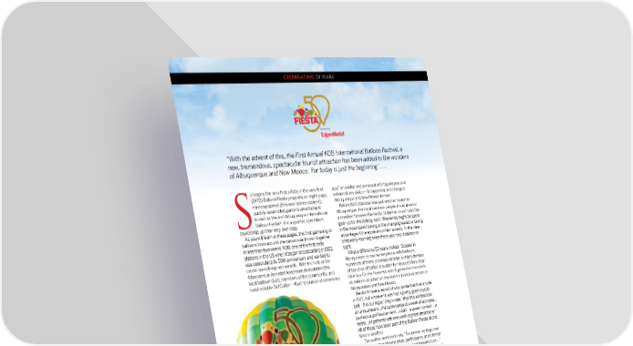 CELEBRATING 50 YEARS “With the advent of this, the First Annual KOB International Balloon Festival, a new, tremendous, spectacular tourist attraction has been added to the wonders of Albuquerque and New Mexico. For today is just the beginning” . . . o begins the very fi rst article in the very fi rst guy,” an aviator and aeronaut with big dreams and (1972) Balloon Fiesta program, an eight-page, extraordinary vision -- it happened, and changed mimeographed (this was before copiers!), Albuquerque and New Mexico forever. quickly-assembled guide to what today is Before 1972, October was just another month in known as the fi rst Albuquerque International Albuquerque. For local business people, it was time for Balloon Fiesta®. For a quarter, spectators a breather between the hectic State Fair crunch and the S could snap up their very own copy. gear-up for the holiday rush. Weekends might be spent As you will learn in these pages, this fi rst gathering of in the mountains looking at the changing leaves or taking balloons from around the nation was thrown together advantage of the apple and chile harvests. In the clear, in less than two weeks. KOB, one of the fi rst radio crisp early morning skies there was nary a balloon in stations in the US when it began broadcasting in 1922, sight. was celebrating its 50th anniversary and wanted to What a diff erence 50 years makes! October in create something memorable. With the help of the Albuquerque is now synonymous with balloons, Albuquerque Aerostat Ascension Association (the hundreds of them, a canopy of color, a child’s fantasy local balloon club), members of the community, and of bunches of balloons suddenly released into a clear most notably Sid Cutter -- that “chamber of commerce blue sky. On the business side, it generates hundreds most notably Sid Cutter -- that “chamber of commerce of millions of dollars in revenue for local businesses in Albuquerque and New Mexico. We don’t have a record of who wrote that fi rst article in 1972, but whoever it was had a pretty good crystal ball. “It is our hope,” they wrote, “that this will become an annual event…the culmination of a week of activities… perhaps a golf tournament… a ball… a queen contest… a perhaps a golf tournament… a ball… a queen contest… a fi esta... all gathered into one week of great attractions.” All of these have been part of the Balloon Fiesta at one time or another. The author went on to say, “Tomorrow, we begin our next year. We welcome ideas, participants, and interest from every civic-minded individual and organization…” As we begin our next 50 years, we echo that sentiment. We have had the privilege, over the past fi ve decades, of living the magic and telling the story of the Balloon Fiesta. We invite you, through these pages, to discover that magic, and hope you’ll be inspired to become part of the story for the next 50 years. Kim Vesely Editor Wally Book, Dick Brown, John C. Davis, IV, Jennifer Garcia, Jacqueline Hockey, Charlotte Kinney, Rod May, Tom McConnell, M.D., Lisa Mulder, Lynne Newton, Sam Parks, Stephanie Prendergast, Paul Rhetts, Dick Rice, Harry Season, John Sena, Paul Smith, Mark Sullivan, Al Tetreault, Ken Tuley, Ty Young: program authors and members of the AIBF Heritage Committee ® 6 Albuquerque International Balloon Fiesta