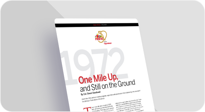 THE 1970'S: 1972-1979 1972 One Mile Up, and Still on the Ground By Col. Brent Stockwell From the 1991 Balloon Fiesta program, reprinted with permission from Ballooning, the Journal of the Balloon Federation of America here I was, altimeter indicating 5,000 balloons from eight states had entered the race. Some feet, with some guy standing next to the withdrew or merely failed to appear; some aeronauts basket yelling, "Get ready; you're up soon, were caught in an unseasonal snowstorm in Chicago, get ready to take off ." What in the world but twelve aeronauts representing California, Arizona, was happening? Today was the day I had Iowa, Michigan, Texas, Minnesota, Nevada and of course Tplanned to plant a second crop of lettuce New Mexico, made the launch site. If all nineteen in my tiny, San Francisco-fog-enshrouded backyard entries had appeared, Albuquerque could have claimed vegetable garden. Who was this man and why was he the largest balloon gathering in the United States, telling me to take off while I was already one mile up (and exceeding the seventeen balloons at last year’s National still on the ground)? Championships at Indianola, Iowa. This episode was no aeronaut's mushroom-inspired Radio station KOB, Albuquerque's NBC affi liate, was fantasy, but the Albuquerque International Coyote and celebrating its 50th anniversary in broadcasting. Their Roadrunner Balloon Race, a hot-air balloonist's dream on network affi liation inspired Don Piccard to dub the a mile-high plateau in New Mexico. California contingent 'The CBS Team", representing of On very, very short notice (due to some Madison course, the California Balloon Society. Another Piccard Avenue-type brainstorming, I suspect), the Albuquerque pun, and another club was born. Aerostat Ascension Association had staged a Aeronauts arriving in Albuquerque were treated like professional, BFA-sanctioned race in a one balloon town. visiting brass. In fact, each pilot was commissioned Well, it once was a one balloon town. "Colonel, Aide-de-Camp" on the Staff of the Governor of The amazingly short time in which this race was the State of New Mexico by Governor Bruce King! New organized was matched by the short length of time Mexico now has a balloon air force. needed by aeronauts all over the country to organize Race day started at 6:00 a.m., calm and clear despite themselves and congregate on Albuquerque’s desert the fact that Albuquerque had just suff ered a terrible plain. With notice of a bit over a week, nineteen pilots and sandstorm the previous week and natives pointed ® 62 Albuquerque International Balloon Fiesta