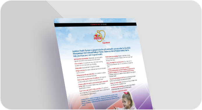 CELEBRATING 50 YEARS Lovelace Health System is proud to be the offi cial health care provider for the 2022 Albuquerque International Balloon Fiesta. Below is a list of helpful safety tips to help you enjoy your visit in good health: Limit alcohol consumption. Remember, you’re at a mile- Watch where you’re going. Beware of vehicles moving high altitude, which could increase alcohol’s impact. around the fi eld, especially emergency vehicles trying to get Dress in layers. It’s sometimes very cool in the morning, through the crowd. but after sunrise it will warm up noticeably. Bring a fl ashlight for evening events. Also, take note of Bring water.Stay hydrated throughout the day. where you parked your car—it’s more diffi cult to fi nd in the dark. Bring sunscreen. At a higher altitude you’re at an increased risk for sunburn. Lovelace Health System’s emergency medical professionals provide on-site emergency medical care for Bring appropriate eye protection. Sun and wind could be problems ranging from minor scrapes to heart attacks. your enemies on a sunny or windy day. Lovelace’s medical volunteers will be located at the Lovelace Don’t smoke anywhere near the balloons. A lit cigarette First Aid Center. could possibly ignite a balloon’s propane fuel tank. The best way to prevent COVID is to avoid being exposed Choose a place to meet in case someone gets separated to the virus and to get vaccinated and boosted. or lost. Make sure young children have some form of Clean your hands often and avoid touching your eyes, nose identifi cation on them. and mouth with unwashed hands. Don’t “drive and watch” at the same time.The balloons Practice social distancing by putting at least 6 feet of are a magnifi cent but distracting sight. Move completely off distance between yourself and other people. to the side of the road to watch. Cover your coughs and sneezes. Lovelace Health System’s emergency medical professionals provide on-site emergency medical care for problems ranging from minor scrapes to heart attacks. Lovelace’s medical volunteers will be located at the Lovelace First Aid Center. * © 2022 Lovelace Health System All rights reserved. These materials may not be reproduced, in whole or in part, without crediting Lovelace for use. ® 212 Albuquerque International Balloon Fiesta
