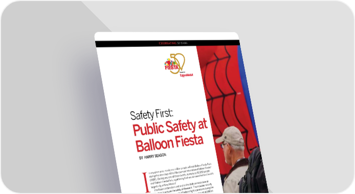 CELEBRATING 50 YEARS Safety First: Public Safety at Balloon Fiesta BY HARRY SEASON n any given year, nearly one million people will visit Balloon Fiesta Park during the nine days of the Albuquerque International Balloon Fiesta® (AIBF). During any one of those events, as many as 80,000 people visit Balloon Fiesta Park, a gathering that would make the Park the fifth largest city in New Mexico! IThe Board of Directors and staff of the Balloon Fiesta take all reasonable steps to ensure the safety of the event. This includes not only flight safety involving the thousands of balloon flight operations during the nine-day event, but also making sure our guests on the ground at Balloon Fiesta Park are safe. To help AIBF meet these extraordinary requirements, we have established a Balloon Fiesta Public Safety program, whose main purpose is the protection of our guests at Balloon Fiesta Park in all aspects not involving flight operations, which is maintained through its own safety programs (see the article on page 218). The Balloon Fiesta Public Safety program is designed to provide law enforcement, fire and rescue capabilities and medical assistance to our guests. The Public Safety program is led by an AIBF Director of Public Safety who manages the integration of multiple federal, state, county and city agencies to ensure coordinated and prompt responses to any incident that might occur at Balloon Fiesta Park during the event. These coordination activities include multiple meetings conducted over many months preceding each Balloon Fiesta, where roles and responsibilities of Right: Albuquerque Police – just one of the alphabet soup of agencies involved in public safety at the Balloon Fiesta. ® 208 Albuquerque International Balloon Fiesta