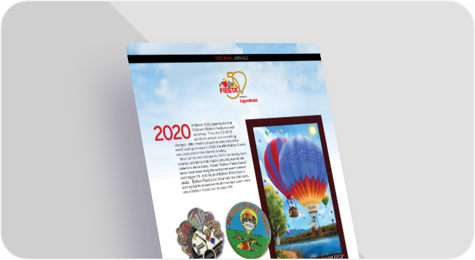 THE 2020s: 2020-2022 In March 2020, planning for that October’s Balloon Fiesta was well 2020underway. Then, the COVID-19 pandemic arrived, and everything changed. After months of work to determine if the event could go forward in 2020, the 49th Balloon Fiesta was postponed in the interest of safety. Much of the merchandise for 2020 had already been ordered, and items that made it onto the market are collectors’ items today. Added “Balloon Fiesta Siesta” items commemorating the postponed event were an even bigger hit. And not all of Balloon Fiesta took a siesta – Balloon Fiesta Live! streamed new interviews and highlights of past events all nine days. Learn more about Balloon Fiesta Live! on page 240 ® 256 Albuquerque International Balloon Fiesta