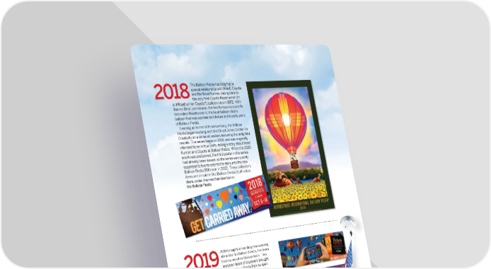 The Balloon Fiesta has long had a special relationship with Wile E. Coyote 2018and the Road Runner, dating back to the very fi rst Coyote-Roadrunner (or is it Roadrunner-Coyote?) balloon race in 1972. With Warner Bros.’ permission, the two famous scoundrels decorated Roadrunner II, the local balloon club’s balloon that was a prominent fi xture in the early years of Balloon Fiesta. Leading up to the 50th anniversary, the Balloon Fiesta began working with the Chuck Jones Center for Creativity on a series of posters featuring the delightful rascals. The series began in 2018, and was originally intended to be in four parts, telling a story about Road Runner and Coyote at Balloon Fiesta. When the 2020 event was postponed, the third poster in the series had already been issued, so the series was quickly expanded to fi ve to extend the story into the new Balloon Fiesta 50th year in 2022. These collector’s items are on sale in the Balloon Fiesta Stuff online store, under the merchandise tab on store, under the merchandise tab on the Balloon Fiesta the Balloon Fiesta 2019 brought an exciting new evening attraction to Balloon Fiesta, the Team 2019Fastrax aerial exhibition team. This precision team of skydivers brought the American fl ag into Balloon Fiesta Park to open the evening events. After the Balloon Glows and Glowdeos, they made a second jump, this one featuring pyrotechnics! OFFICIAL PROGRAM 239