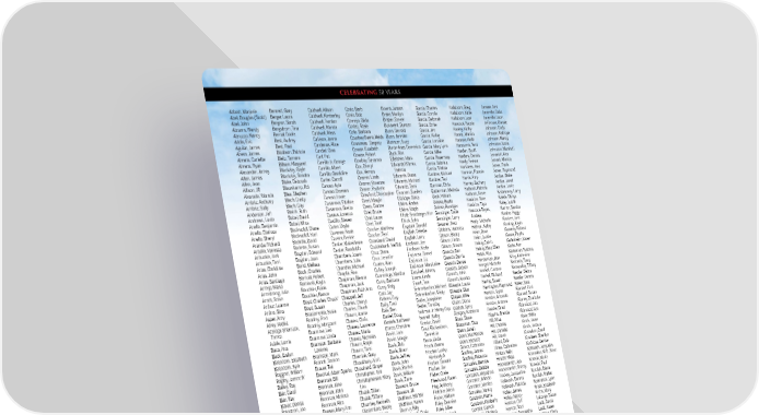 CELEBRATING 50 YEARS Abbott, Marjorie Bennett, Gary Caldwell, Allison Corio, Barb Downs, Jansen Garcia, Charles Hallstrom, Greg Jansen, Joni Abel, Douglas (Scott) Berger, Laura Caldwell, Kimberley Corio, Bob Drake, Marilyn Garcia, Connie Hallstrom, Katie Jaramillo, Dalia Abel, John Bergren, Sarah Caldwell, Trenten Cornejo, Gilda Draper, Steven Garcia, Deborah Hallstrom, Lori Jaramillo, Leon Abrams, Wendy Bergstrom, Tina Caldwell, Wanda Cortez, Rosie Dunavent, Duncan Garcia, Ernie Hancock, Nicole Jeff erson, Connie Abruzzo, Nancy Bernal, Dodie Caldwell, Wess Cote, Barbara Dunn, Gerrold Garcia, Jim Hanley, Kathy Johnson, Cody Addis, Eric Best, Audrey Callison, Janna Courtney Bueno, Neida Dunn, Jennifer Garcia, Kathy Hanna, Marion Johnson, Kathryn Aguilar, James Best, Paul Cardenas, Alice Cousineau, Gregory Dunnum, Suzy Garcia, Lorraine Hannon, Keith Johnson, Nancy Ahern, James Biddison, Patricia Cardiel, Gina Cowan, Elizabeth Duran-Arias, Domenica Garcia, Mary Lynn Hanoumis, Terri Johnston, Karla Ahrens, Carlette Bietz, Tamara Carl, Pat Cowan, Robert Dyck, Ron Garcia, Mike Harden, Scott Johnston, Marshall Ahrens, Ryan Billson, Margaret Carrillo Jr, George Cowboy, Savanna Edelstein, Marv Garcia, Rosemary Harders, Dennis Jonard II, Alex Alexander, Jamey Blackaby, Gayle Carrillo, Albert Cox, Cheryl Edwards Witmer, Garcia, Sabrina Hardy, Selena Jonard, Monica Allen, James Blackaby, Sondra Carrillo, Geraldine Cox, Vernon Patricia Garcia, Triston Harkness, Inez Jones, Frank Allen, Jean Blake, Deborah Carter, Carroll Cramer, Linda Edwards, Diana Gardner, Michael Harmon, Francie Jones, Raymond Allison, JR Blauwkamp, Rol Caruso, Ayla Cramer, Roxanne Edwards, Michael Gardner, Teri Harris, Amy Jordan, Blake Alvarado, Yolanda Blea, Stephen Caruso, Dorreen Craner, Paullette Edwards, Tami Garman, Chris Harvey, Zachary Jordan, Janet Ambriz, Anthony Blech, Dusty Caruso, Louie Crawford, Christopher Einarsen, Suellen Gatterman, Melinda Hathoot, Patricia Jordan, Janie Ambriz, Sally Blech, Gay Casanova, Ettaline Creel, Margie Eldridge, Stacy Geck, William Hathoot, Steve Kaibetoney, Larry Anderson, Jeff Bleich, Ruth Casanova, Gretta Cress, Dianne Elkins, Andee Gefeke, Beate Hawkins, Bree Kakde, Shriya Andrews, Linda Bobel, David Casaus, Lorenzo Criel, Bruce Elkins, Ralph Gefeke, Ruediger Hawkins, Taya Kaley, Judith Anello, Benjamin Bobel, Mina Castillo, Steven Criel, Laura Elliott-Snoeberger, Kim Gensinger, Darla Heacock-Reyes, Kamm, Sandra Anello, Clarissa Bockwoldt, Diane Caton, Doyle Criel, Todd Elrick, John Gensinger, Larry Andrea Kaniho, Peggy Anello, Sheryl Bockwoldt, Karl Cavenee, Noah Crocker, Matthew Engdahl, Donald Gessner, Fred Healy, Michelle Kautzer, Jane Aranda, Richard Bodette, David Cavner, Denise Crocker, Terri English, Celeste Gibbons, Veronica Heff ron, Kathy Keating, Kayla Arballo, Vanessa Bodette, Susan Center, Mabel Irene Crossland, David English, Larry Gibson, Becky Heim, Dave Keaveny, Robert Arbuckle, Joel Bogdan, Edward Center, Randolph Cruickshank, Neffi tti Erickson, Jim Gibson, Linda Heim, Jackie Keene, Phyllis Arbuckle, Terri Bogdan, Joan Chambers, Joann Cruz, Diana Erickson, Keith Gibson, Steven Heinly, Calvin Keifenheim, Karen Arias, Christina Bond, Melissa Chambers, Julia Cruz, Jennifer Espinosa, Daniel Giersch, Ben Heinly, Mary Ellen Kelbe, Kim Arias, John Book, Charles Chandler, Michael Cuales, Alan Espinoza, Liz Giersch, Darrla Helak, Rita Kellerman, Natoria Arias, Santiago Borruel, Robert Chaplin, Ron Culley, Joseph Espinoza, MaryLaine Giersch, Denae Henderson, Don Kelly, Katherine Armijo, Maria Bottinelli, Kayla Chapman, Glenna Cummings, Martha Esquivel, Johnny Giersch, Jadyen Hengel, Michelle Kennedy, Tracy Armstrong, Julie Bouchier, Frank Chapman, Jack Curry, Barbara Evans, Linda Giersch, John Henkel, Carmen Kenworthy, Tiff any Arndt, Steve Bouchier, Nance Chapman, Ruth Ann Curry, Visty Ewart, Tom Giersch, Kendra Henkel, Richard Kessler, Debra Arthur, Luanne Boyd, Charles 'Chuck' Chappell, Jeff Czar, Jay Fehrenbacher, Michael Gillespie, Laura Hering, Susan Kessler, Dennis Artino, Gina Boyd, Susan Charles, Cheryl Dahms, Guy Fehrenbacher, Misty Gillespie, Stan Herrington, Raymond Kibler, Sara Asper, Amy Bracamonte, Susie Charles, Chuck Daily, Fred Felder, Josephine Gilligan, Mike Herson, Taylor Kinnard, Carl Atrey, Vedika Bradley, Fred Chavez, Aaron Dale, Ben Felder, Timothy Gilson, Diana Hessler, Amanda Kinnard, Susan Attridge Shemack, Bradley, Margaret Chavez, Chris Daniel, Doug Feltman Jr, Henry Guy Gladish, Jerry Hessler, Andrew Kinney, Charlotte Teresa Brammer, Leo Chavez, Lawrence Daniels, Kathleen Fennell, Kathy Glaspey, Kathleen Hessler, Brad Kirkwood, Jon Auble, Lorrie Brammer, Linda Chavez, Maria D'arco, Christine Fenske, David Glass, Steve Higgins, Brenda Kirkwood, Lyn Baca, Ana Bramson, Barbara Chavez, Nicholas David, Jack Fenzi-Richardson, Glassman, Elsa Hill, Alisa Kiser, Willie Back, Evalyn LaVerne Chavez, Ralph David, Margie Demetria Glenn, Janell Hill, Charles Klock, Jaron Bacoccini, Elizabeth Bramson, Mark Chavez, Tami Davis, Bob Ferro, Linda Glenn, MacKenzie Hill, Danielle Klock, Joshua Bacoccini, Kyle Branch, Doreen Cherniak, Gary Davis, Gram Finch, Deana Glenn, Richard Hill, Jacob Knowlton, Carol Baggett, William Brauer, Teri Choudhary, Amit Davis, Jeff rey Fincher-Lucky, Glover, Catherine Hillard, Deb Knudsen, Sherilyn Bagley, James W Brechtel, Adam Sparks Chouinard, Ginger Davis, John Kimberly A Godfrey, James Hines, Catherine Kochicas, Denise Bailey, Ray Brennan, Bill Christopher, Tom Davis, Rachel Fischer, Donald Godfrey, Rebecca Hinton, Kelly Kohlasch, Jacquelin Bair, Carol Brennan, Jane Christophersen, Mary Davis, William Fischer, Jim Gonzales, Bernice Hirschl, Meta Komadina, M.D., Steve Bair, Ray Brennan, John Lou Davis, Zane Fisher, Orele Gonzales, Debbie Hockersmith, Jon Koreski, Marie Baker, Denise Brennan, Melissa Chubb, Dillan Dawson, Bruce Fleetwood, Karen Gonzales, Miquelina Hockersmith, Sherry Koreski, Paul Balestreri, Joe Brennan, Rita C