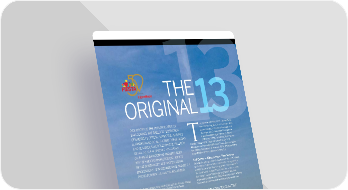 THETTHHE E ORIGINAL OORRIIGGIINNAALL131133 131131113333 DICK BROWN IS THE FORMER EDITOR OF he year was 1972 and KOB 770 AM Radio BALLOONING, THE BALLOON FEDERATION was celebrating its 50th anniversary. With some coaxing from the station’s general OF AMERICA’S OFFICIAL MAGAZINE, AND HAS manager, Sid Cutter agreed to organize AUTHORED AND COAUTHORED THREE BOOKS a southwestern-style Hare-and-Hound balloon race that he dubbed Roadrunner- AND NUMEROUS ARTICLES ON THE BALLOON T Coyote balloon race. Today we know it as the fi rst FIESTA. HE’S A RESPECTED HISTORIAN Albuquerque International Balloon Fiesta. Sanctioned by ON THINGS BALLOONING AND HAS ALSO the Balloon Federation of America (BFA), it was to be the WRITTEN BOOKS ON HISTORICAL TOPICS largest ballooning event in North America. IN THE SOUTHWEST. HIS PROFESSIONAL Sid Cutter – Albuquerque, New Mexico. BACKGROUND IS IN ENGINEERING, AND HE’S A Sid was the younger son of civil aviation pioneers William PROUD FORMER U.S. NAVY SUBMARINER. and Virginia Cutter who founded Cutter Flying Service in 1928 to serve the fl ourishing aviation community in the Southwest. At age 21 Sid joined the Air Force. First Lieutenant Cutter fl ew single-engine jets and four- Pictured: Roadrunner ready to go as Don Piccard infl ates engine cargo planes until 1960 when he joined the family Spirit of 76 and Karl Stefan infl ates Star of Texas. business and served as the company’s president for STORY AND PHOTOS BY DICK BROWN, FOR THE AIBF HERITAGE COMMITTEE OFFICIAL PROGRAM 53