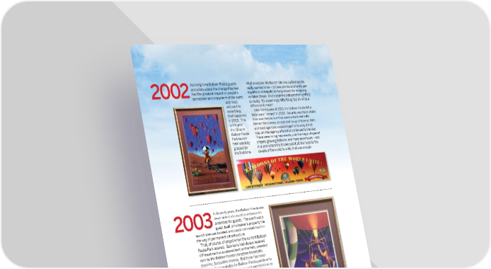 Ask long-time Balloon Fiesta guests All of a sudden, the launch site was a place people and pilots about the change they feel really wanted to be – to have picnics and family get- 2002had the greatest impact on people’s togethers, to tailgate, to hang around for shopping perception and enjoyment of the event, on Main Street. And it kept the balloons from getting and most so dusty. It’s a seemingly little thing, but oh, what a will point to diff erence it made! something After the trauma of 2001, the Balloon Fiesta felt a that happened little more “normal” in 2002. Security was more visible in 2002. This than ever before, but that made people feel safer. is the year Behind the scenes, an alphabet soup of federal, state, the 78-acre and local agencies worked together to keep it that Balloon Fiesta way, an interagency eff ort that continues to this day. Park launch There were no big new events, just the magic of special fi eld was fully shapes, glowing balloons, and mass ascensions – and grassed for in a year where the theme said it all, the need for the the fi rst time. people of the world to unite, that was enough. In its early years, the Balloon Fiesta was never able to do much to enhance its 2003amenities for guests. The event was a guest itself, on whoever’s property the launch site was located, and could not install much in the way of permanent infrastructure. That, of course, changed when the current Balloon Fiesta Park opened. Sponsors had always received VIP treatment in a catered tent on the fi eld, presided over by the Balloon Fiesta’s longtime hospitality doyenne, Jacqueline Hockey. But there had never been anything available for Balloon Fiesta guests who were not affi liated with a sponsor, but wanted a luxury experience. That changed in 2003 with the opening of the Gondola Club, an exclusive, expansive area with catered gourmet dining, special close-in parking, shuttle service around the fi eld, and – best of all! – (portable) fl ush toilets! Gondola Club tickets are still in high demand today, as are the Balloon Fiesta’s new Concierge tours, “Glamping” accommodations on a nearby ball fi eld, and RV spaces in the President’s Compound overlooking the park. In 2009, the Chasers’ Club was created to off er meals and seating for guests at a lower price point. ® 204 Albuquerque International Balloon Fiesta