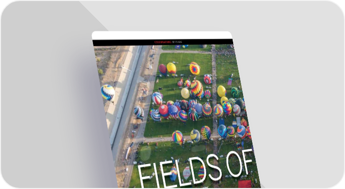 CELEBRATIBG 50 YEARS FIELDS OF BY KIM VESELY, FOR THE AIBF HERITAGE COMMITTEE Through the fi rst half of its 50-year history, the Albuquerque International Balloon Fiesta® led a nomadic existence, steadily migrating northward through fi ve launch sites in step with the city’s steady development. Each of the Balloon Fiesta’s launch sites had its own personality and each played a distinct role in the event’s history. A ANT B OR T O: VIC T PHO ® 126 Albuquerque International Balloon Fiesta