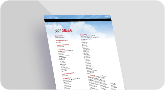 2022 Offi cials Balloonmeister Scoring Offi cials Henry Rosenbaum Tammy Luna, Chief Scoring Offi cial Rita Brennan, Assistant Chief Scoring Offi cial Assistant Balloonmeister Jay Luna, Chief of Targets Peg Billson John Abel Carlette Ahrens Assistant Balloonmeister Ryan Ahrens Maury Sullivan Amy Asper Safety Offi cials Patty Biddison John Brennan Tom Bueno, Chief Safety Offi cial Melissa Brennan Melissa Bond Taylor Currier Roger Clark Mike Gilligan Neida Courtney Bueno Penny Griego Doug Gallagher Harold Jackson Mike Garcia Phyllis Jackson J.D. Huss Blake Jordan Alex Jonard II Carl Kinnard Mike Liberti Susan Kinnard Ted Maes Jon Kirkwood Chuck Raskob Lyn Kirkwood Thomas Schroeder Bob Lucero Paul Suttle Becca McConaghy Administrative Assistant Jurgen Rimac Lynn Sullivan Patricia Ann Rudy-Baese Virgina Sanchez Weather Offi cials Launch Directors Brad Temeyer, Chief Weather Offi cial Michelle Healy, Chief Launch Director Duncan Dunavent Chris Padilla, Assistant Chief Launch Director John Elrick Cliff Holman, North/South Section Lead Katherine Kelly Lynn Tillery, North/South Section Lead Randy Lefevre Jay Pape, Assistant South Section Lead Robert Wise Anna Brody, Assistant North Section Lead Landowner Relations Joseph Ballengee Martha McKinney Karl Schaefer Nancy Wertz, Chief Landowner Relations Offi cial Bill Brennan Lora McKown Daniel Schulz Wally Book Elisa Bustamante Christina Meadows Nicole Tagart Karen Brown Nicholas Chavez Pam Micker Deborah Taylor Jim Holley Tom Christopher Jeanie Moughan Mike Taylor Nancy Holley David Crossland Cathy Myrick Michael Trahan Larry Merry Jeff Dill Caitlin Odom Laura Virgin Janette Stone Karen Fleetwood Sarah Pearson Dylan Wambold Orbin Stone Kevin French Kat Perea Lawrence Wambold Larry Gensinger Katrin Phillips Caryn Welz Balloon Refueling Area Debbie Gonzales Ron Phillips Kimberly Whiteman Mike Chandler, Balloon Refueling Chief Theodore Gransbury Emily Pine Rachel Wills Kim Kelbe Bill Rager Janice Wrhel Tiff any Kenworthy Jeff Renegar Glenn Young Shawn Leonard Char-Lynn Richardson Michael Zink Rachael Lujan Debbie Sanchez Danny McCoy Samantha Sanchez OFFICIAL PROGRAM 213
