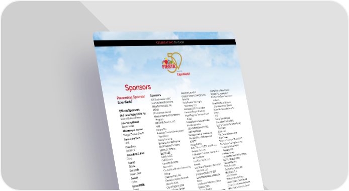 CELEBRATING 50 YEARS Sponsors Presenting Sponsor Sponsors Goodbye Laundry! Realty One of New Mexico ExxonMobil 505 Southwestern, LLC Graybar Electric Company, Inc. RESPEC Company, LLC A Virtual Receptionist, Inc. Greystar Rio Grande Down Syndrome Abba Technologies, Inc. HollyFrontier Refi ning & Network Offi cial Sponsors AKIMA Marketing, LLC Ronald McDonald House 96.3 News Radio KKOB-FM Albuquerque Journal Holmans USA Corporation Charities of New Mexico Voice of Balloon Fiesta Albuquerque Youth Symphony Hueman People Solutions Route 66 Casino Hotel & RV Albertsons Market Program Hyatt Regency Tamaya Resort Resort Supermarket AMERIND Benefi ts, LLC & Spa RPS ANM Indian Pueblo Cultural Center Siarza Social Digital Albuquerque Journal Intel Corporation Sola Salon Studios ABQ Twilight Twinkle Glow™ Arizona Tile Arkansas Tourism Development J & A Oilfi eld Services, LLC Solaray Vitamins by Better Being Bank of the West Foundation Jabil Healthcare Company Bank Baca’s Trees, Inc. Kampgrounds of America, Inc. Sullair, LLC Coca-Cola Banterra Aircraft Finance Kiwanis Club of Albuquerque TBC General Contracting Soft Drink BNSF Railway Company KOB-TV Team Texas Bobby J’s Yamaha Krispy Kreme Telemundo of New Mexico, LLC Creamland Dairies KRQE News 13/FOX New Mexico The Balloon Training Academy Dairy Bubba’s 33 Cabela’s, LLC Kubicek Balloons The Garrity Group Public Cuervo La Mesa RV Center, Inc. New Mexico Relations, LLC Tequila Call 811.com Cameron Balloons La Vida Llena The Maez Group Dos Equis Cavender’s LeafFilter North, LLC The Neighborhood in Rio Rancho Import Beer Central New Mexico Community Lennox TLC Plumbing & Utility Dunkin’ College LightHouse Business Information T-Mobile USA, Inc. Coff ee Chalmers Ford, Inc. Solutions, LLC TORC Robotics General Mills Champion Xpress Carwash Lindstrand Balloons, USA TransPerfect Global, Inc. Cereal Chick-fi l-A, Inc. Lone Mountain by Jubilee Los UltraMagic, S.A. City of Page, Arizona Lunas United Rentals Harvest Hosts Los Suenos Veterinary Group United States Air Force VIP West RV Lot City of Taipei, Taiwan Civil Air Patrol Indiana Molson Coors United States Coast Guard Isleta Resort & Casino Coronado Center Morgan Stanley University of Kansas Jayhawks Launch Field Pylons Cosmic Crisp National Distributing Company, Inc. UNM Health Sciences Center Jameson Irish Whiskey Cottonwood Mall National Park Service US Bank Whiskey Curb North, Inc. Network Chiropractic of USI Southwest Krispy Kreme Curves by Haalo, Ltd. Albuquerque VLCM Technologies Krispy Kreme Morning Glow Dell Technologies New Mexico Gas Company Waste Management of New Mexico Digitool, USA New Mexico Mutual Group WERA Lovelace Health System Niagara Bottling, LLC Westwind Computer Products, Inc. Healthcare Provider Donate Life - New Mexico Donor Services New Mexico State University Wonder Bread Phillips 66 NUPAC of New Mexico Xfi nity Gasoline Dreamstyle Remodeling Farmers Insurance, Rod Baca Occidental USA, Inc. Zia Diagnostic Imaging, LLC PNC Bank Agency Optiv Balloon Discovery Center Federal Bureau of Investigation Optum New Mexico Sandia Resort & Casino Fiesta Auto Group, LLC Phillips 66 Company Aerial Light Show Fiore Industries, Inc. PlainsCapital Bank | Hilltop University of New Mexico First Financial Credit Union Securities Sports Properties Fortis Construction, Inc. Preventive Pest Control, LLC Balloon Trading Cards Friends of Coronado Rainbow Ryders, Inc. Frost Mortgage Banking Group RAKS Building Supply Visit Albuquerque Re/Max Marketing Fund, LLC Visitors Golden Corral ® 28 Albuquerque International Balloon Fiesta