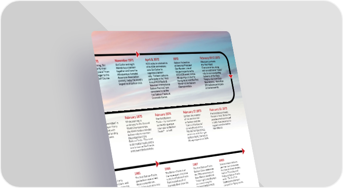 June 6, 1971 November 1971 April 8, 1972 1972 February 10-17, 1973 The next morning, Sid Sid Cutter and eight KOB radio, in celebration Balloon Federation Albuquerque hosts and Bill Cutter fl y their friends buy a balloon of its 50th anniversary, of America President the First World “party centerpiece” from together and form the asks Sid Cutter to Don Kersten, one of Championships, along the Cutter hangar to the Albuquerque Aerostat organize a balloon the participants in the with an additional “Fiesta” UNM North Golf Course.Ascension Association rally. Thirteen balloons 1972 KOB event, invites rally for non-competing (AAAA), today the world’s participate in the “First Albuquerque to bid for balloons, at the State largest local balloon club. Annual KOB Radio & the rights to hold the First Fairgrounds (now Expo Television International World Hot Air Balloon New Mexico). More than Balloon Festival,” now Championships. 100 balloons participate considered to be the in the two events. fi rst Balloon Fiesta, at Coronado Center. February 1975 February 1974 February 17, 1973 February 10, 1973 ens committee” is While planning is The third Balloon Ed Yost, the inventor The fi rst Balloon Fiesta y Mayor Harry underway for the Second Fiesta – by now known of the modern hot- Parade is held. Before the o assist with World Championships, as the Albuquerque air balloon and the parades are discontinued putting on and funding the AAAA holds a two-day International Balloon “Clerk of the Course” in 1991, they become the alloon Fiesta. balloon rally to maintain Fiesta® – is held. (chief offi cial) of the biggest parades held in the presence of the World Championships, New Mexico. Balloon Fiesta. This event makes an exhibition gas is still held annually and is balloon fl ight, the fi rst in now known as the Friends Albuquerque since 1909. and Lovers Balloon Rally. 1981 1986 1987 1989 en Abruzzo, Larry The fi rst Balloon Fiesta The Balloon Fiesta is on The fi rst Balloon Fiesta Special shape balloons on Clark, and gas balloon race is held; the move again, this time Balloon Glow celebrates get their own showcase, oki complete the these competitions, to the fi rst Balloon Fiesta the 75th anniversary of the Special Shape Rodeo, t manned transpacifi c which focus on accuracy Park located south of New Mexico statehood. held on Thursday and ight aboard in fl ying to a target as Alameda Blvd. (now the These nighttime displays Friday of Balloon Fiesta agle V opposed to distance, RV park). are now among the week. The fi rst few continue through the Balloon Fiesta’s most Rodeos are afternoon 1980’s. popular events competition fl ying events. 1973 1979 1982