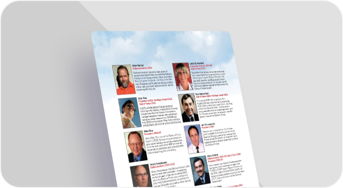 Allen Rector Linda Rutherford Balloonmeister 1998 Executive Director 1979-89 Balloonmeisters typically have years of Hall of Fame 2001 experience before they become the Balloon One of the fi rst female corporate balloon pi- Fiesta’s chief fl ying events offi cer, and Allen lots, Linda Rutherford was well-known even Rector’s path is typical – he fl ew in the Bal- before becoming the Balloon Fiesta’s fi rst loon Fiesta as a pilot and served as a safety paid staff member and Executive Director. offi cer and assistant balloonmeister before She laid the groundwork for the year-round assuming the top job. staff and volunteer operation that makes the Balloon Fiesta happen. Dick Rice Tom Rutherford President 1983; Heritage Award 2016 Hall of Fame 1983; Heritage Award 2010 Hall of Fame 2015 As a young KOB radio employee, Tom In 1975, with the Balloon Fiesta’s existence Rutherford was instrumental in organizing teetering in the balance, Richard (Dick) Rice was KOB’s 50th anniversary celebration, resulting brought onto the fi rst Citizen’s Committee to in the fi rst Balloon Fiesta. Tom became a manage the event’s fi nances. He’s still doing it, corporate balloonist and state legislator, and having served as treasurer from 1978-85 and for 40 years as an event announcer was the from 2002 to the present. When Dick’s not busy golden voice of the Balloon Fiesta. writing checks, he is still an active balloon pilot. Mike Rice Jim Schumacher President 2014-15 President 1993 When Mike Rice joined the Balloon Fiesta Albuquerque restauranteur Jim Schum- board in 2002, he was an experienced avi- acher brought his business acumen to the ation administrator as well as a balloonist. Board of Directors, and to his roles as Vice As is the case with most AIBF presidents, President and President, working with local he served as secretary and vice-president organizations to resolve issues and promote before assuming the presidency. the Balloon Fiesta. Henry Rosenbaum Harry Season Balloonmeister 2019-2022 Balloonmeister 1992-93: Hall of Fame 2009 Henry Rosenbaum, the Balloon Fiesta’s 25th President 2000-01 and current balloonmeister, is beginning Harry Season was Balloon Fiesta president his fourth year in the job (counting 2020, during two of its most historic years: the when the Balloon Fiesta was postponed). “1,000 in 2000” largest Balloon Fiesta ever, Like most balloonmeisters, he worked his and 2001, when the event lifted spirits and way up the ladder as a safety offi cer and as helped to heal a shattered world in the wake assistant balloonmeister. of 9-11. Harry still serves on the Balloon Fiesta board. Bob Ruppenthal John Sena Balloonmeister 1976; President 1989-90 President 2010-11; Hall of Fame 2013 Hall of Fame 1991; Heritage Award 2007 A colorful storyteller and longtime In 1973, a group of grubby British balloonists balloonist, John Sena (so far) has served participating in the World Championships were more than two decades on the board. A taken in by the Ruppenthal family, and that was banker by trade, John was the event’s just the beginning of Bob Ruppenthal’s storied treasurer and fi nancial advisor for many involvement in the Balloon Fiesta. Bob was also years. John is also the founder of another of a huge contributor to ballooning safety through New Mexico’s iconic ballooning events, the his research, lectures and articles. Taos Mountain Balloon Rally. Marge Ruppenthal Jim Shiver President 1980-81; Hall of Fame 1988 President 1986-88; Hall of Fame 1993 Executive Director 1989-95 Heritage Award 2011 Heritage Award 2007 Guests enjoy today’s Balloon Fiesta Park in Marge Ruppenthal, like her husband Bob, large part thanks to the eff orts of Jim Shiver. became an accomplished pilot before He played a major role in securing the property, serving in just about every leadership role in and through his construction company contrib- Balloon Fiesta. She was Executive Direc- uted thousands of dollars and man-hours to tor for six of the Balloon Fiesta’s greatest building this and previous launch sites. Jim is growth years, which included the addition of the Balloon Fiesta's only three-time President. the Balloon Glow and Special Shape Rodeo. OFFICIAL PROGRAM 267