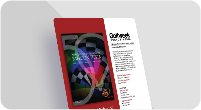 1000 Legion Place, Suite 725 | Orlando, FL 32801 CustomMedia.Golfweek.com The Albuquerque International Balloon Fiesta offi cial program is published by Golfweek Custom Media, a division of USA Today Sports Media Group. For information on national advertising opportunities, special event magazine production or any of our other custom publishing capabilities, please call 407.563.7012 or visit www. CustomMedia.Golfweek.com. Publisher/Creative Director Michael C. Hagmann Production Coordinator Gabi Weaver ADVERTISING Director of Sales Ted Mersch 407-563-7045 [email protected] Advertising Director Eric Smooke Offi cial Publisher of 407-563-7010 the Albuquerque International Balloon Fiesta ® 50th Anniversary Program Golfweek Custom Media is the nation’s leading publisher of highly targeted event programs for the nation’s most prestigious events. For more information and to browse all of our digital editions, please visit us at www.custommedia.golfweekcom.