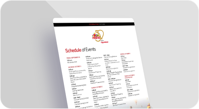 CELEBRATING 50 YEARS Schedule of Events FRIDAY, SEPTEMBER 30 6:00 pm 8:00 - Noon MONDAY, OCTOBER 3 7:00 a.m. America’s Challenge Gas Balloon Chainsaw Carving Exhibition 6:00 am Albuquerque Aloft Race Launch 9:00 am Dawn Patrol 6:00 pm Fiesta of Wheels Car Show 7:00 am SATURDAY, OCTOBER 1 Twilight Twinkle Glow™, (located on north end of Launch Double Balloon Launch and presented by Albuquerque Field) Competition 5:45 am Journal 10:00 am Aerial Light Show, sponsored by 8:00 - Noon Sandia Resort & Casino 7:30 pm Chainsaw Carving Auction Chainsaw Carving Exhibition Team Fastrax™ Skydiving 11:00 am 10:00 am 6:00 am 7:45 pm Balloon Fiesta Pin Trading (Group Dawn Patrol Show, presented by Chainsaw Carving Auction Route 66 Casino Hotel and RV Aerial Light Show, sponsored by Tour Tent north end of Main Resort Sandia Resort & Casino Street) 8:00 pm* 3:00 - 6:00 pm TUESDAY, OCTOBER 4 6:30 am AfterGlow™ Fireworks Show Chainsaw Carving Exhibition COCA-COLA DAY Krispy Kreme Morning Glow 6:00 am 6:45 am 5:00 pm Dawn Patrol Opening Ceremonies SUNDAY, OCTOBER 2 Team Fastrax™ Skydiving 6:00 pm 7:00 am 7:00 am 5:45 am Double Balloon Launch and Mass Ascension Aerial Light Show, sponsored by Balloon Glow, powered by Competition Sandia Resort & Casino ExxonMobil 8:00 - Noon 7:30 pm 8:00 - Noon Chainsaw Carving Exhibition 6:00 am Chainsaw Carving Exhibition Dawn Patrol Show, presented by Team Fastrax™ Skydiving 10:00 am Route 66 Casino Hotel and RV 7:45 pm 10:00 am Chainsaw Carving Auction Resort Aerial Light Show, sponsored by Chainsaw Carving Auction 2:00 pm 6:30 am Sandia Resort & Casino America’s Challenge Gas Balloon Krispy Kreme Morning Glow 8:00 pm* Infl ation AfterGlow™ Fireworks Show 3:00 - 6:00 pm 7:00 am Mass Ascension Chainsaw Carving Exhibition 7:30 – 11 am 5:00 pm Fiestas de Los Globitos (Remote Team Fastrax™ Skydiving Control Balloons Exhibition) ® 20 Albuquerque International Balloon Fiesta