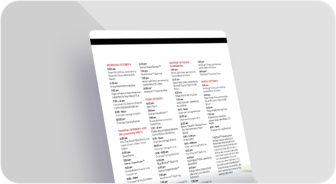 WEDNESDAY, OCTOBER 5 6:00 pm SATURDAY, OCTOBER 8 – 7:45 pm 6:00 am Special Shape Glowdeo™ ExxonMobil Day Aerial Light Show, sponsored by Dawn Patrol Show, presented by 7:30 pm 5:45 am Sandia Resort & Casino Route 66 Casino Hotel and RV Team Fastrax™ Skydiving Aerial Light Show, sponsored by 8:00 pm* Resort 7:45 pm Sandia Resort & Casino AfterGlow™ Fireworks Show 6:30 am Aerial Light Show, sponsored by 6:00 am Krispy Kreme Morning Glow Sandia Resort & Casino Dawn Patrol Show, presented by SUNDAY, OCTOBER 9 7:00 am 8:00 pm* Route 66 Casino Hotel and RV 5:45 am Flight of Nations Mass Ascension, AfterGlow™ Fireworks Show Resort Aerial Light Show, sponsored by presented by New Mexico True 6:30 am Sandia Resort & Casino 7:30 – 11 am FRIDAY, OCTOBER 7 Krispy Kreme Morning Glow 6:00 am Fiestas de Los Globitos (Remote 6:00 am 7:00 am Dawn Patrol Show, presented by Control Balloons Exhibition) Dawn Patrol Mass Ascension, powered by Route 66 Casino Hotel and RV 8:00 - Noon ExxonMobil Resort Chainsaw Carving Exhibition 7:00 am 8:00 - Noon Special Shape Rodeo™ 6:30 am 10:00 am Chainsaw Carving Exhibition Krispy Kreme Morning Glow Chainsaw Carving Auction 7:00 am 10:00 am Double Balloon Launch and 7:00 am Competition Chainsaw Carving Auction Farewell Mass Ascension, THURSDAY, OCTOBER 6 KIDS’ 7:30 – 11 am 11:00 am sponsored by News Radio 770 DAY presented by KOB- TV Fiestas de Los Globitos (Remote Balloon Fiesta Pin Trading (Group KKOB 4:30 am Control Balloons Exhibition) Tour Tent north end of Main 8:00 - Noon Kids’ Day Goodie Bag Distribution Street) Chainsaw Carving Exhibition 8:00 - Noon 1:00 – 5:00 pm begins (South of Main Street Chainsaw Carving Exhibition Stage) Music Fiesta * AfterGlow™ fi reworks shows 10:00 am 3:00 - 6:00 pm 6:00 am Chainsaw Carving Auction will begin as soon as the launch Dawn Patrol Chainsaw Carving Exhibition fi eld is clear of balloons, thus the 3:00 - 6:00 pm 5:00 pm starting times are approximate and 7:00 am Chainsaw Carving Exhibition Special Shape Rodeo™ Team Fastrax™ Skydiving subject to change without notice. 5:00 pm 6:00 pm Additionally, local police will modify 7:00 am Team Fastrax™ Skydiving traffi c fl ows to utilize all traffi c lanes Double Balloon Launch and Night Magic™ Glow, powered by Competition 6:00 pm ExxonMobil for outbound traffi c only at the Special Shape Glowdeo™ 6:00 pm conclusion of each Glow event. So if 8:00 - Noon 7:30 pm you want to watch the AfterGlow™ Chainsaw Carving Exhibition Fiestas de Los Globitos Glow fi reworks shows from the Park, plan Team Fastrax™ Skydiving (Remote Control Balloons 10:00 am 7:45 pm Exhibition) to arrive at the Park in time for that Chainsaw Carving Auction Aerial Light Show, sponsored by evening’s glow event. 3:00 - 6:00 pm 7:30 pm Sandia Resort & Casino Team Fastrax™ Skydiving Chainsaw Carving Exhibition 8:00 pm* 5:00 pm AfterGlow™ Fireworks Show Team Fastrax™ Skydiving OFFICIAL PROGRAM 21