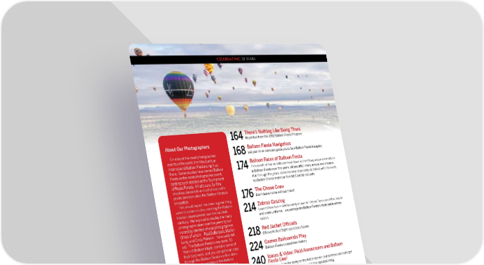 CELEBRATING 50 YEARS There’s Nothing Like Being There 164 Reprinted from the 1992 Balloon Fiesta Program About Our Photographers Balloon Fiesta Navigators On a list of the most photographed 168 Let your inner compass guide you to be a Balloon Fiesta Navigator. events in the world, the Albuquerque International Balloon Fiesta is right up Balloon Faces of Balloon Fiesta there. Some studies have named Balloon 174 Thousands of hot air balloons have fl own in the Albuquerque Internation- Fiesta as the most photographed event, al Balloon Fiesta over the years, all beautiful, many unique and creative. besting such classics as the Tournament But through the years, some became especially identifi ed with the event, of Roses Parade. What’s sure, for fi lm- as Balloon Fiesta historian Tom McConnell recounts. shooting classicists and cell phone selfi e photo bombers alike, the Balloon Fiesta is The Chase Crew irresistible. 176 Don’t leave home without them! This visual impact has been a great thing when it comes to documenting the Balloon Zebras Grazing Fiesta’s development over the last half- 214 Launch Directors – aff ectionately known as “Zebras” because of their black- century. We’re proud to display the many and-white uniforms – are perhaps the Balloon Fiesta’s most visible ambas- photographs taken over the years by our sadors. incredibly talented offi cial photographers (three of whom – Paul DeBerjeois, Marlon Red Jacket Offi cials Long, and Cindy Petrehn – have sadly left 218 us). The Balloon Fiesta’s new book, 50 Oft overlooked fl ight operations teams. Years of Balloon Magic, contains some of Games Balloonists Play their best work, and you can get your copy 224 through the Balloon Fiesta’s online store. Balloon Fiesta competition history. However, for photos of the Balloon Fiesta’s earlier history, we’ve relied on a Voices & Video: Field Announcers and Balloon select group of balloonist/photographers 240Fiesta Live! whose work is invaluable to documenting There’s nothing like being on the fi eld in person, but for those who can’t get the history of the event and of ballooning to Albuquerque, Balloon Fiesta Live! is the next best thing. in New Mexico. Balloon Fiesta historians Dick Brown, Tom McConnell, and Kim Pins, Patches and Other Daubles of Aff ection Vesely all contributed photos from their 252Updated from the 2010 Balloon Fiesta program. personal collections. But we especially want to acknowledge our fellow balloonist Fiesta de Los Globitos, the “Mini Balloon Fiesta” and friend the late Bill Flynt, from Roswell. 260Sam Parks, Balloon Fiesta’s Director of Operations and former While fl ying in events across the country, Balloonmeister, describes how this new event for remote-controlled (RC) Bill took amazing photos; creating probably hot air balloons began and is becoming the Balloon Fiesta’s latest – and the most complete visual history of this popular! -- attraction. exciting time. Our thanks to Suzi Flynt Manus, Bill’s widow and herself a fi ne balloon pilot, for allowing us to use some of his photos, and to balloonist Eric Hodges, the custodian of Bill’s collection, for making For an enhanced experience, scan the QR codes on these them available to us. icons throughout the program to access additional information and content! ® 10 Albuquerque International Balloon Fiesta
