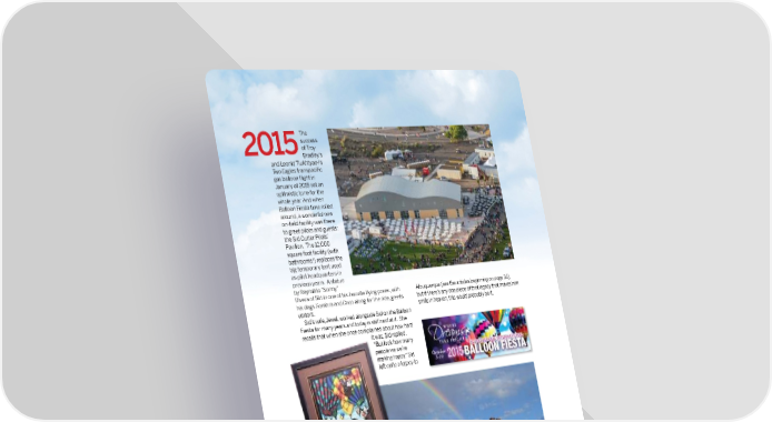The success 2015of Troy Bradley’s and Leonid Tiukhtyaev’s Two Eagles transpacifi c gas balloon fl ight in January of 2015 set an optimistic tone for the whole year. And when Balloon Fiesta time rolled around, a wonderful new on-fi eld facility was there to greet pilots and guests: the Sid Cutter Pilots’ Pavilion. The 12,000 square foot facility (with bathrooms!) replaces the big temporary tent used as pilot headquarters in previous years. A statue by Reynaldo “Sonny” Rivera of Sid in one of his favorite fl ying poses, with Albuquerque (see the articles beginning on page 36), his dogs Sombra and Coco along for the ride, greets but if there’s any one piece of that legacy that makes him visitors. smile in heaven, this would probably be it. Sid’s wife, Jewel, worked alongside Sid on the Balloon Fiesta for many years and today is still hard at it. She recalls that when she once complained about how hard it was, Sid replied, it was, Sid replied, “But look how many “But look how many people we we’re people we we’re making happy.” Sid making happy.” Sid left quite a legacy to left quite a legacy to OFFICIAL PROGRAM 237