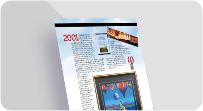 The Balloon Fiesta hit the ripe old age of 30 in 20012001 and more change was in the air, along with the 668 hot air balloons, 20 gas balloons, helicopter helicopter and 82 special shapes registered that hovering hovering year. A new event, Albuquerque Aloft, nearby being one of the nearby being one of the brought balloons to local schools on the more visible), most U.S. pilots more visible), most U.S. pilots Friday before the event’s offi cial start on fl ew American Flags from their baskets fl ew American Flags from their baskets Saturday – a great way for kids to learn or crown lines, and the America’s about balloons and pilots to get their Challenge gas balloon pilots were greeted equipment sorted out and ready to go for suspiciously upon their landings in the the next day’s mass ascension. A new U.S. upper Midwest (at long distance event (or “long jump” in ballooning lingo), least one was ordered to report to law the New Mexico Challenge, gave hot air balloon pilots enforcement). But the Balloon Fiesta the chance to see how far they could travel in a single provided a catharsis for a wounded city fl ight (hint: a lot less far than the America’s Challenge and nation and a triumphant reminder gas balloons). Competition featured a new event, that life goes on, and can even be Balloon Blackjack, where pilots tried to make the best colorful and fun. possible hand by dropping markers on giant playing cards. The Balloon Fiesta moved into its current permanent headquarters a couple of blocks from Balloon Fiesta Park at Alameda Rd. and Balloon Museum Dr. And, 2001 was Kodak’s last year as the event’s title sponsor. But all this was quickly overshadowed by the events of September 11, 2001, when all aircraft – including balloons – were grounded in the wake of the terrorist attacks in New York and Washington. For a couple of weeks, it looked like there might not be a Balloon Fiesta at all. Through the eff orts of New Mexico’s congressional delegation, state and city leaders, and the Balloon Fiesta Board and staff , the fl ight restrictions were lifted in time for the show to go on. But inevitably, the tone of the Balloon Fiesta changed: too many had lost friends and too many others their sense of safety. New security measures were in place (the Black Hawk military OFFICIAL PROGRAM 203