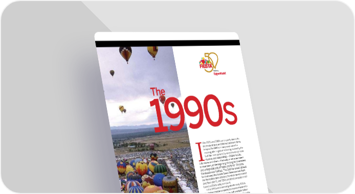 The 1990S f the 1970s and 1980s were a party danced to the throb of disco and Michael Jackson’s funky tempos, the 1990s in many ways were the morning after: a global reckoning marked by the Gulf War, riots speared by concerns about racial injustice, and mass killings – Oklahoma City, I Columbine, and others – that sadly in retrospect seem to have been just the beginning of a long list of senseless and unforgivable acts of malice and terror. Of course, the decade wasn’t all bad. The Cold War ended (at least for that time), the Hubble Space Telescope took flight, the World Wide Web debuted, the stock market soared (and then didn’t), and Y2K’s predicted computer crash turned out to be a big non-event. In the 1990s and extending into the early 2000s, the Balloon Fiesta completed its transformation into essentially the event it is today, with multiple balloon glows, the featured Special Shape events on Thursday and Friday morning and evening, the Dawn Patrol Show on mass ascension mornings, and the thrilling America’s Challenge gas balloon race across the U.S. The event also found its permanent home at the current Balloon Fiesta Park, ending a quarter-century of wandering north through Albuquerque. No longer a teenager, the Balloon Fiesta was coming “of age” and into its early adulthood. PHO T O: BILL W AL T ON FL YNT OFFICIAL PROGRAM 155