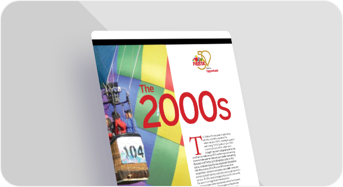 The 2000S he Balloon Fiesta partied right along with the rest of the world in the millennial year 2000, meeting its goal of welcoming “1,000 [balloons] in 2000.” The first decade of the millennium brought new technological tools to the T world and to ballooning: GPS positioning and tracking, more remote weather stations, and better forecasting. Facebook and Twitter (and Wikipedia) came on the scene, revolutionizing the way people get information. With the coming of the iPod and iPhone and their competitors, suddenly everybody had a little computer in their pocket that they could also use as a phone and a camera. For the most photographed event in the world, this was a not insignificant development. The true tone of the decade was set by the terrorist attacks in New York and Washington on September 11, 2001. The Balloon Fiesta almost didn’t happen that year due to the closure of U.S. airspace resulting from the terrorists’ use of airplanes as weapons of mass destruction. That the show went on, and indeed provided a ray of light and color lifting spirits in a dark time, was nothing short of a triumph. But the Balloon Fiesta, like the rest of an increasingly dangerous world, was permanently changed. Safety and security, which had always been a top priority for the event, were enhanced even further. So were amenities on the launch site to make it a pleasant place for guests to linger. For a few hours, people could put aside the PHO cares of the decade and remember what it was like to be a kid again, fascinated by a floating balloon. T O B Y VIC T OR B ANT A OFFICIAL PROGRAM 201