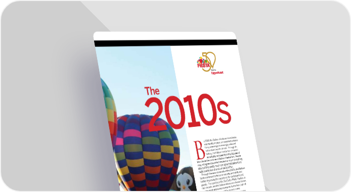 The 2010S y 2010, the Balloon Fiesta we know today was mostly in place, an oasis from a topsy- turvy, seemingly increasingly polarized national and world climate. Through its history, the Balloon Fiesta has remained remarkably removed from the disputes of B life outside the confines of Balloon Fiesta Park. People may not agree about the President or much of anything else, but they pretty much can agree that balloons are really cool to look at and a whole lot of fun. Through the second decade of the 2000s, the Balloon Fiesta continued to focus on security and safety and further improving the experience for participants and guests. The opening of the Sid Cutter Pilots' Pavilion, in mid-decade, and the Balloon Museum a decade before, are the most visible improvements to the Park, but not the only ones, and there will be more to come. By 2019, the Balloon Fiesta was already preparing for its 50th year, then just two years away. Like the rest of the country, little did we know of the surprises the beginning of the next decade would bring. PHO T O B Y VIC T OR B ANT A OFFICIAL PROGRAM 233