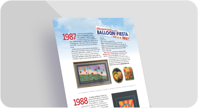 Once upon a time, the Balloon Fiesta was exclusively an early 1987morning event. That all changed in 1987, with the event’s fi rst Balloon evening Glow. Nighttime balloon displays were nothing new in events now in Albuquerque – they’d been held on Christmas Eve often attract more guests to since 1979 – but had never been part of the Balloon Balloon Fiesta Park than the famed morning Fiesta. mass ascensions and extend the color and magic of Scott Appelman came up with the idea of doing a ballooning into the night. And it’s not just Albuquerque. balloon glow at the Balloon Fiesta to celebrate the 75th Balloon Glows are now part of almost every balloon anniversary of New Mexico statehood – and the rest, event in the world. as they say, is history. It was such a hit that today, What’s the story behind the invention of the there are three Balloon Fiesta balloon glows, plus two Balloon Glow? Well, it involved a not entirely sober more featuring exclusively special shape balloons. The night at a northern New Mexico resort, and the creativity of balloonists around the country who enhanced the concept. Learn more from the 1987, 1988, 1996, and 2009 Balloon Fiesta programs in the Collectors Corner on the Balloon Fiesta website, balloonfi esta.com. By 1988, the Balloon Fiesta had grown to 600 balloons, including an 1988increasing number of special shapes. These balloons – including The G-R-R-E-A-T Tony and Earforce One (better known as Mickey Mouse) – were crowd-pleasers every bit as popular as the Bees and Darth Vadar are today, with crowds packed onto their launch sites. The event now also featured an all-female skydiving team, the Misty Blues, which jumped on alternate weekends from the Army Golden Knights. It was obvious the Balloon Glow, started the previous year, was there to stay. People loved the option of a nighttime event. But one event, the gas balloon race, was headed for hiatus. Only one gas balloon “competed” in 1988, and was promptly awarded third place (much to the annoyance of pilot George Hahn.) When gas ballooning returned to the Balloon Fiesta, it would be in a much diff erent form – and it would be there to stay. there to stay. ® 124 Albuquerque International Balloon Fiesta
