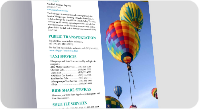 HOW DO I NAVIGATE AROUND ALBUQUERQUE? TRAIN NM Rail Runner Express (505) 245-7245 www.nmrailrunner.com The Railrunner is a commuter rail running through the heart of Albuquerque. Spanning 100 miles from Santa Fe to Belen through the beautiful Rio Grande Valley. The train corridor has 13 stations, operating seven days a week. For more information on this excellent transportation option, please follow the link to Rail Runner Express or call (505) 245-7245. PUBLIC TRANSPORTATION For ABQ Ride bus schedules and routes, call (505) 243-RIDE (7433). For Sun Tran bus schedules and routes, call (505) 843-9200. www.cabq.gov/transit/tran.html TAXI SERVICES Albuquerque and Santa Fe are serviced by multiple cab companies: ABQ Metro Taxi Service ....(505) 450-8580 Checker Cab ....................(505) 243-7777 Giant Cab ........................(505) 293-4222 NM Black Car Service .......(505) 316-1100 Rio Rancho Cab ...............(505) 506-1111 Albuquerque Taxi Service .(505) 331-3903 zTrip ............................... (505) 247-8888 RIDE SHARE SERVICES Please use your Ride Share Apps for scheduling rides with Ride Share services. SHUTTLE SERVICES Santa Fe Shuttle (505) 243-2300 / 1-888-833-2300 or online at www.shuttlesantafe.com Provides safe, comfortable travel between Albuquerque and Santa Fe.