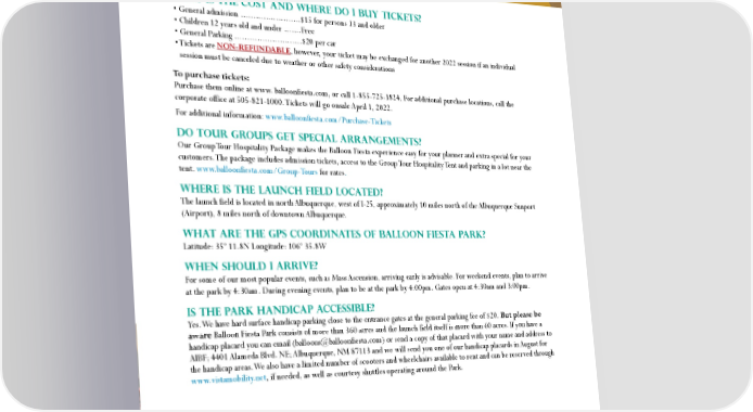 S S S S BALLOON FIE TA FREQUENTLY A KED QUE TION WHAT IS THE COST AND WHERE DO I BUY TICKETS? • General admission ........................$15 for persons 13 and older • Children 12 years old and under .......Free • General Parking ...........................$20 per car • Tickets are NON-REFUNDABLE, however, your ticket may be exchanged for another 2022 session if an individual session must be canceled due to weather or other safety considerations To purchase tickets: Purchase them online at www. balloonfiesta.com, or call 1-855-725-1824, For additional purchase locations, call the corporate office at 505-821-1000. Tickets will go onsale April 1, 2022. For additional information: www.balloonfiesta.com/Purchase-Tickets DO TOUR GROUPS GET SPECIAL ARRANGEMENTS? Our Group Tour Hospitality Package makes the Balloon Fiesta experience easy for your planner and extra special for your customers. The package includes admission tickets, access to the Group Tour Hospitality Tent and parking in a lot near the tent. www.balloonfiesta.com/Group-Tours for rates. WHERE IS THE LAUNCH FIELD LOCATED? The launch field is located in north Albuquerque, west of I-25, approximately 10 miles north of the Albuquerque Sunport (Airport), 8 miles north of downtown Albuquerque. WHAT ARE THE GPS COORDINATES OF BALLOON FIESTA PARK? Latitude: 35º 11.8N Longitude: 106º 35.8W WHEN SHOULD I ARRIVE? For some of our most popular events, such as Mass Ascension, arriving early is advisable. For weekend events, plan to arrive at the park by 4:30am. During evening events, plan to be at the park by 4:00pm. Gates open at 4:30am and 3:00pm. IS THE PARK HANDICAP ACCESSIBLE? Yes. We have hard surface handicap parking close to the entrance gates at the general parking fee of $20. But please be aware Balloon Fiesta Park consists of more than 360 acres and the launch field itself is more than 60 acres. If you have a handicap placard you can email ([email protected]) or send a copy of that placard with your name and address to AIBF; 4401 Alameda Blvd. NE; Albuquerque, NM 87113 and we will send you one of our handicap placards in August for the handicap areas. We also have a limited number of scooters and wheelchairs available to rent and can be reserved through www.vistamobility.net, if needed, as well as courtesy shuttles operating around the Park. HOW DO WE CONTACT THE BALLOON FIESTA DIRECTLY? E-mail us at [email protected] for the quickest response 4401 Alameda Boulevard NE, Albuquerque, NM 87113 Toll-Free 1-888-422-7277 Phone 505-821-1000 Fax: 505-828-2887