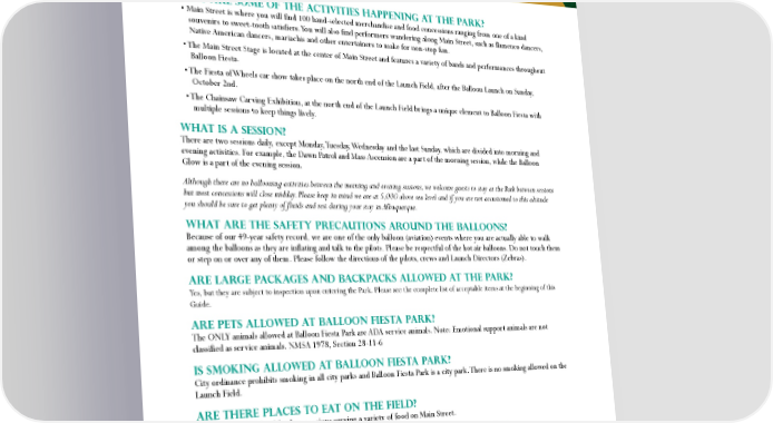 S S S S BALLOON FIE TA FREQUENTLY A KED QUE TION WHAT ARE SOME OF THE ACTIVITIES HAPPENING AT THE PARK? • Main Street is where you will find 100 hand-selected merchandise and food concessions ranging from one of a kind souvenirs to sweet-tooth satisfiers. You will also find performers wandering along Main Street, such as flamenco dancers, Native American dancers, mariachis and other entertainers to make for non-stop fun. • The Main Street Stage is located at the center of Main Street and features a variety of bands and performances throughout Balloon Fiesta. • The Fiesta of Wheels car show takes place on the north end of the Launch Field, after the Balloon Launch on Sunday, October 2nd. • The Chainsaw Carving Exhibition, at the north end of the Launch Field brings a unique element to Balloon Fiesta with multiple sessions to keep things lively. WHAT IS A SESSION? There are two sessions daily, except Monday, Tuesday, Wednesday and the last Sunday, which are divided into morning and evening activities. For example, the Dawn Patrol and Mass Ascension are a part of the morning session, while the Balloon Glow is a part of the evening session. Although there are no ballooning activities between the morning and evening sessions, we welcome guests to stay at the Park between sessions but most concessions will close midday. Please keep in mind we are at 5,000 above sea level and if you are not accustomed to this altitude you should be sure to get plenty of fluids and rest during your stay in Albuquerque. WHAT ARE THE SAFETY PRECAUTIONS AROUND THE BALLOONS? Because of our 49-year safety record, we are one of the only balloon (aviation) events where you are actually able to walk among the balloons as they are inflating and talk to the pilots. Please be respectful of the hot air balloons. Do not touch them or step on or over any of them. Please follow the directions of the pilots, crews and Launch Directors (Zebras). ARE LARGE PACKAGES AND BACKPACKS ALLOWED AT THE PARK? Yes, but they are subject to inspection upon entering the Park. Please see the complete list of acceptable items at the beginning of this Guide. ARE PETS ALLOWED AT BALLOON FIESTA PARK? The ONLY animals allowed at Balloon Fiesta Park are ADA service animals. Note: Emotional support animals are not classified as service animals. NMSA 1978, Section 28-11-6 IS SMOKING ALLOWED AT BALLOON FIESTA PARK? City ordinance prohibits smoking in all city parks and Balloon Fiesta Park is a city park. There is no smoking allowed on the Launch Field. ARE THERE PLACES TO EAT ON THE FIELD? There is a multitude of food concessions serving a variety of food on Main Street. CAN YOU BRING IN OUTSIDE FOOD & DRINKS TO THE PARK? Yes, but glass and alcohol are not allowed. You cannot use hard-sided coolers. Bags and soft sided coolers are subject to search.