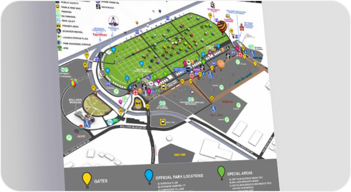 S MAP OF BALLOON FIE TA PARK 1 GATES OFFICIAL PARK LOCATIONS SPECIAL AREAS A) GONDOLA CLUB A) VISIT ALBUQUERQUE MEDIA TENT B) SPONSOR HOSPITALITY B) BALLOON MANUFACTURERS C) CORPORATE VILLAGE C) VISIT ALBUQUERQUE & NEW MEXICO TRUE TICKET BOOTHS D) SID CUTTER PILOTS’ PAVILION VISITOR INFORMATION E) CHASERS’ CLUB D) BALLOON RIDES TENT F) GROUP TOURS HOSPITALITY G) PNC BANK BALLOON DISCOVERY CENTER H) FIESTA SKY BOX ENTERTAINMENT INFORMATION 1) MAIN STREET STAGE M)OFFICIAL MERCHANDISE 2) CHAINSAW CARVERS TENTS 3) ARTISANS TENT TM 4) MUSIC FIESTA 5) KIDS ZONE