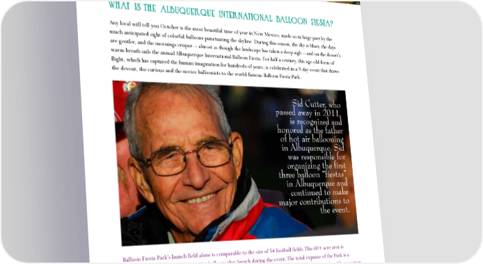 S S WHAT I THE ALBUQUERQUE INTERNATIONAL BALLOON FIE TA? Any local will tell you October is the most beautiful time of year in New Mexico, made so in large part by the much anticipated sight of colorful balloons punctuating the skyline. During this season, the sky is bluer, the days are gentler, and the mornings crisper -- almost as though the landscape has taken a deep sigh -- and on the desert’s warm breath sails the annual Albuquerque International Balloon Fiesta. For half a century, this age-old form of flight, which has captured the human imagination for hundreds of years, is celebrated in a 9-day event that draws the devout, the curious and the novice balloonists to the world-famous Balloon Fiesta Park. Sid Cutter, who passed away in 2011, is recognized and honored as the father of hot air ballooning in Albuquerque. Sid was responsible for organizing the first three balloon “fiestas” in Albuquerque and continued to make major contributions to the event. Balloon Fiesta Park’s launch field alone is comparable to the size of 54 football fields. This 60+ acre area is necessary to accommodate the 500+ balloons that launch during the event. The total expanse of the Park is a whopping 365 acres, custom designed to facilitate the largest ballooning event on earth. Since its humble inception at a shopping mall parking lot in 1972, with a total of 13 balloons, the Albuquerque International Balloon Fiesta has grown into the most photographed event in the world.