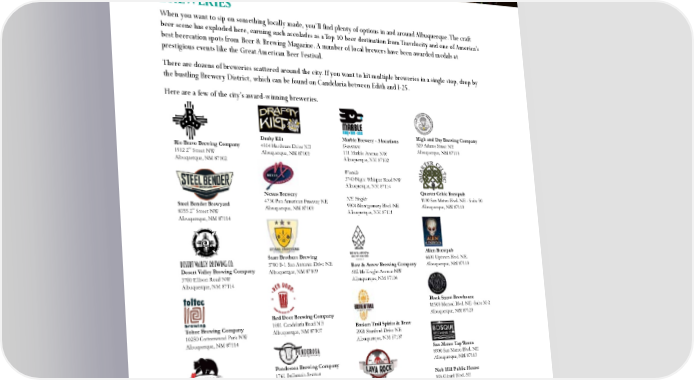 S WHAT CAN I DO AFTER THE BALLOON ? BREWERIES When you want to sip on something locally made, you’ll find plenty of options in and around Albuquerque. The craft beer scene has exploded here, earning such accolades as a Top 10 beer destination from Travelocity and one of America’s best beercation spots from Beer & Brewing Magazine. A number of local brewers have been awarded medals at prestigious events like the Great American Beer Festival. There are dozens of breweries scattered around the city. If you want to hit multiple breweries in a single stop, drop by the bustling Brewery District, which can be found on Candelaria between Edith and I-25. Here are a few of the city’s award-winning breweries. Marble Brewery - 3 locations High and Dry Brewing Company Drafty Kilt 529 Adams Street NE Rio Bravo Brewing Company 4814 Hardware Drive NE Downtown Albuquerque, NM 87110 nd 111 Marble Avenue NW 1912 2 Street NW Albuquerque, NM 87109 Albuquerque, NM 87102 Albuquerque, NM 87102 Westside 5740 Night Whisper Road NW Albuquerque, NM 87114 Nexus Brewery Quarter Celtic Brewpub 4730 Pan American Freeway NE NE Heights 1100 San Mateo Blvd. NE - Suite 50 Steel Bender Brewyard Albuquerque, NM 87109 9904 Montgomery Blvd. NE Albuquerque, NM 87110 nd 8355 2 Street NW Albuquerque, NM 87111 Albuquerque, NM 87114 Alien Brewpub Starr Brothers Brewing 6601 Uptown Blvd. NE. 5700 B-1 San Antonio Drive NE Bow & Arrow Brewing Company Albuquerque, NM 87110 Desert Valley Brewing Company Albuquerque, NM 87109 602 McKnight Avenue NW 3700 Ellison Road NW Albuquerque, NM 87104 Albuquerque, NM 87114 Black Snout Brewhouse 11500 Menaul Blvd. NE -Suite M-2 Red Door Brewing Company Albuquerque, NM 87120 Toltec Brewing Company 1001 Candelaria Road NE Broken Trail Spirits & Brew 10250 Cottonwood Park NW Albuquerque, NM 87107 2921 Stanford Drive NE Albuquerque, NM 87114 Albuquerque, NM 87107 San Mateo Tap Room 8900 San Mateo Blvd. NE Ponderosa Brewing Company Albuquerque, NM 87113 1761 Bellamah Avenue Albuquerque, NM 87104 Nob Hill Public House Lava Rock Brewing Company 106 Girard Blvd. SE Albuquerque, NM 87106 2220 Unser Blvd. Boxing Bear Brewing Company Albuquerque, NM 87107 10200 Corrales Road Bosque North Corrales, NM 87048 834 US-550 Canteen Brewhouse Bernalillo, NM 87004 2381 Aztec Road NE Albuquerque, NM 87107 Santa Fe Brewing Company Casa Vieja Brewing 3600 Cutler NE Ex Novo Brewing Company 4541 Corrales Road Albuquerque, NM 87110 4895 Corrales Road Corrales, NM 87048 Corrales, NM 87048
