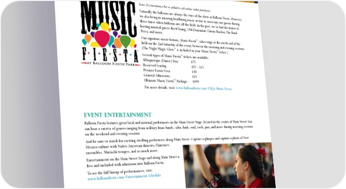 S ENTERTAINMENT AT BALLOON FIE TA AND MORE Note: A Convenience Fee is added to all online ticket purchases. Naturally the balloons are always the stars of the show at Balloon Fiesta. However, we also bring in amazing headlining music artists to entertain our guests during those times when balloons are off the field. In the past, we’ve had the honor of hosting musical guests Brett Young, Old Dominion, Darius Rucker, The Band Perry, and more. Our signature music feature, Music Fiesta™, takes stage at the north end of the field on the 2nd Saturday of the event, between the morning and evening sessions. ™ ™ (The Night Magic Glow is included in your Music Fiesta ticket.) TM ™ Several types of Music Fiesta tickets are available: Albuquerque (Dance) Box: $75 ® Reserved Seating: $55 - $65 Premier Lawn Area: $30 General Admission: $15 ™ Package: $499 Ultimate Music Fiesta For more details, visit: www.balloonfiesta.com/FAQs-Music-Fiesta EVENT ENTERTAINMENT Balloon Fiesta features great local and national performers on the Main Street Stage, located in the center of Main Street. You can hear a variety of genres ranging from military brass bands, salsa, funk, soul, rock, jazz, and more during morning sessions on the weekend and evening sessions. And be sure to watch for exciting strolling performers along Main Street. Capture a glimpse and capture a photo of New Mexico culture with Native American dancers, Flamenco ensembles, Mariachi troupes, and so much more. Entertainment on the Main Street Stage and along Main Street is free and included with admission into Balloon Fiesta. To see the full lineup of performances, visit: www.balloonfiesta.com/Entertainment-Schedule