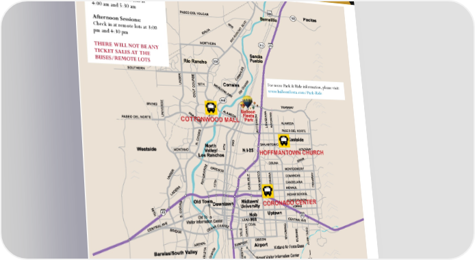 A MAP OF THE 2022 PARK & RIDE LOCATION S Morning Sessions: Check in at remote lots at 4:00 am and 5:30 am Afternoon Sessions: Check in at remote lots at 3:00 pm and 4:30 pm THERE WILL NOT BE ANY TICKET SALES AT THE BUSES/REMOTE LOTS For more Park & Ride information, please visit: www.balloonfiesta.com/Park-Ride COTTONWOOD MALL HOFFMANTOWN CHURCH CORONADO CENTER