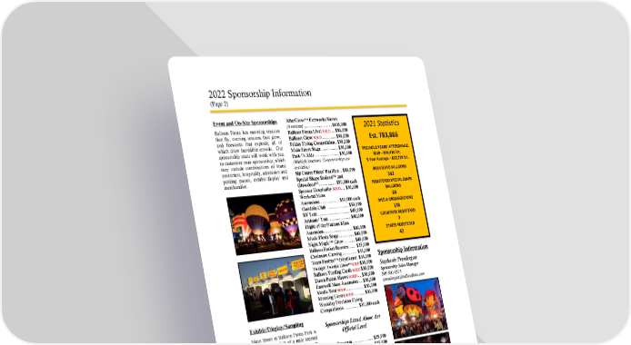 Event and On-Site Sponsorships Balloon Fiesta has morning sessions that fly, evening sessions that glow, and fireworks that explode, all of which draw incredible crowds. Our sponsorship team will work with you to customize your sponsorship, which may include combinations of brand awareness, hospitality, admission and parking passes, exhibit/display and merchandise. Exhibit/Display/Sampling Main Street at Balloon Fiesta Park is approximately 1/3 of a mile located along the east side of the Launch Field. Both north and south ends can accommodate large exhibits and the center section can accommodate some of the smaller footprints. Exhibit space pricing is $10/square foot and electricity may be provided depending on location. Product sampling booths are 10’x10’, and are located directly across from the concession booths selling food and merchandise. The sponsorship fee of $4,000 includes the tent, Astroturf, ceiling light, tent signage, table and two chairs. All sampling booths have access to electricity. Booth staff will be provided with parking and admission tickets. AfterGlow™ Fireworks Shows (5 sessions) ........................... $135,000 Balloon Fiesta Live! SOLD ... $50,000 Balloon Glow SOLD ............. $50,000 Friday Flying Competition .. $50,000 Main Street Stage ............... $50,000 Park ‘N Ride ....................... $50,000 (Multiple locations; Co-sponsorships are available.) Sid Cutter Pilots’ Pavilion .. $50,000 Special Shape Rodeos™ and Glowdeos™ ................ $50,000 each Sponsor Hospitality SOLD .... $50,000 Weekend Mass Ascensions .................. $50,000 each Gondola Club .................... $50,000 RV Lots .............................. $45,000 Artisans’ Tent ..................... $40,000 Flight of the Nations Mass Ascension ............................ $40,000 Music Fiesta Stage .............. $40,000 Night Magic™ Glow .......... $40,000 Balloon Basket Banners ....... $35,000 Chainsaw Carving .............. $35,000 Team Fastrax™ (skydivers) . $35,000 Twilight Twinkle Glow™ SOLD $35,000 Balloon Trading Cards SOLD $30,000 Dawn Patrol Shows SOLD .... $30,000 Farewell Mass Ascension .... $30,000 Media Tent SOLD ................. $30,000 Morning Glows SOLD .......... $30,000 Weekday Precision Flying Competitions .............. $30,000 each Sponsorships Listed Above Are Official Level Event Program .................... $25,000 Mobile App SOLD ................ $25,000 Video Boards (2) SOLD ......... $25,000 Chasers’ Club ..................... $20,000 75’ Tall Field Signage Cone (4 total) SOLD ................ $15,000 each Or All 4 ............................... $50,000 RC Balloons Exhibitions ..... $15,000 Media Towers ............. $12,500 each Charging Station Tents ....... $10,000 Hand Sanitizing Stations ..... $10,000 Sunscreen Dispensers (5) ....... $7,500 WayFinders Main Street ...... $5,000 Bike Valet ............................. $4,000 Fiesta Courtesy Carts – Inside Park Only SOLD ........................ $500 each Sponsorship Information Stephanie Prendergast Sponsorship Sales Manager 505-300-4575 sprendergast@balloonfiesta.com Albuquerque International Balloon Fiesta® 4401 Alameda Boulevard NE Albuquerque, NM 87113 www.balloonfiesta.com 2021 Statistics Est. 783,866 PREVIOUS YEARS’ ATTENDANCE: 2019 – 866,414 Est. 5 Year Average – 852,719 Est. REGISTERED BALLOONS 543 REGISTERED SPECIAL SHAPE BALLOONS 84 MEDIA ORGANIZATIONS 138 COUNTRIES REGISTERED 7 STATES REGISTERED 42 2022 Sponsorship Information (Page 2)