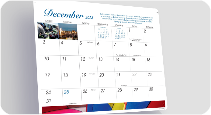 Balloon Fiesta is one of the few balloon events in the world where spectators can actually walk on the field and be up close and personal with the balloons, pilots December 2023 and crew. And when it comes to Balloon Glows, spectators join in the fun by lighting up the night with their cell phones. Sunday Monday Tuesday Wednesday Thursday Friday Saturday November January S M T W T F S S M T W T F S 1 2 1 2 3 4 1 2 3 4 5 6 5 6 7 8 9 10 11 7 8 9 10 11 12 13 12 13 14 15 16 17 18 14 15 16 17 18 19 20 19 20 21 22 23 24 25 21 22 23 24 25 26 27 26 27 28 29 30 28 29 30 31 Dec 1, 1783, First Gas Balloon Manned Free Flight 3 4 5 Last Quarter 6 7 8 9 Pearl Harbor Day, 1941 Hanukkah Begins 10 11 12 New Moon 13 14 15 16 17 18 19 First Quarter 20 21 22 23 Winter Begins 24 25 26 Full Moon 27 28 29 30 31 Christmas Day 244419_Mnt.indd 1244419_Mnt.indd 1 4/4/22 7:43 AM4/4/22 7:43 AM