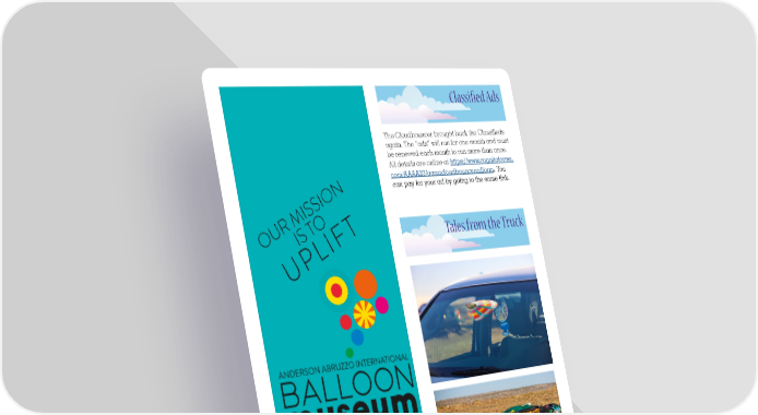 Classified Ads The Cloudbouncer brought back the Classifieds again. The “ads” will run for one month and must be renewed each month to run more than once. All details are online at https://www.cognitoforms. com/AAAA23/aaaacloudbounceradform. You can pay for your ad by going to the same link. N O I S S I M R O U T T S Tales from the Truck O I LIF UP Shoppe & Memberships Forever Legacy Tiles Partnerships Photo Credit: Triston Garcia balloonmuseum.com No stories this issue,please consider submitting for the future issues. 16 aaaa cloudbouncer JANUARY 2023