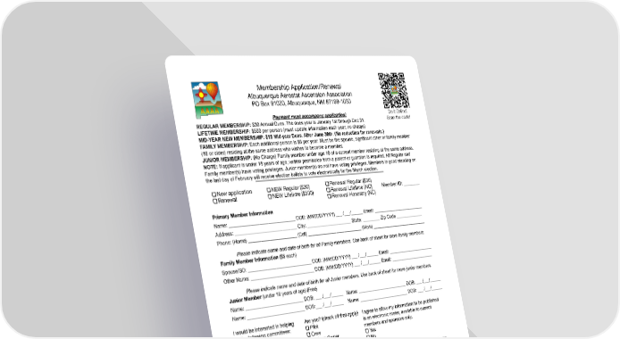 Membership Application/Renewal Albuquerque Aerostat Ascension Association PO Box 91030, Albuquerque, NM 87199-1030 Payment must accompany application! Do It Online! REGULAR MEMBERSHIP: $30 Annual Dues. The dues year is January 1st through Dec 31. Scan the code! LIFETIME MEMBERSHIP: $500 per person (must update information each year, no charge) MID-YEAR NEW MEMBERSHIP: $15 Mid-year Dues. After June 30th. (No reduction for renewals.) FAMILY MEMBERSHIP: Each additional person is $5 per year. Must be the spouse, significant other or family member (16 or older) residing at the same address who wishes to become a member. JUNIOR MEMBERSHIP: (No Charge) Family member under age 16 of a current member residing at the same address. NOTE: If applicant is under 18 years of age, written permission from a parent or guardian is required. All Regular and Family member(s) have voting privileges. Junior member(s) do not have voting privileges. Members in good standing on the last day of February will receive election ballots to vote electronically for the March election. New application NEW Regular ($30) Renewal Regular ($30) Member ID: ________ Renewal NEW Lifetime ($500) Renewal Lifetime (NC) Renewal Honorary (NC) Primary Member Information Name: _______________________________ DOB: (MM/DD/YYYY) ___ /___/______ Email: __________________________ Address: _____________________________ City: ______________________ State: _________ Zip Code ______________ Phone: (Home) _______________________ (Cell) ___________________________ (Work) ____________________________ Please indicate name and date of birth for all Family members. Use back of sheet for more family members. Family Member Information ($5 each) Spouse/SO: ______________________________ DOB: (MM/DD/YYYY) ___ /___/______ Email: _______________________ Other Name: ______________________________ DOB: (MM/DD/YYYY) ___ /___/______ Email: ______________________ Please indicate name and date of birth for all Junior members. Use back of sheet for more junior members. Junior Member (under 16 years of age) (Free) Name: ___________________________ DOB: ___ /___/______ Name: _________________________ DOB: ___ /___/______ Name: ___________________________ DOB:___ /___/______ Name: _________________________ DOB: ___ /___/______ I would be interested in helping Are you? (check all that apply) I agree to allow my information to be published on the following committees: Pilot in an electronic roster, available to current Cloudbouncer Crew members and sponsors only. Community Relations Balloon Owner Yes Crew Development Other ____________ No Education Flying Events I would like to receive a hard copy of the Cloudbouncer newsletter mailed to me Membership for an additional $15 per year fee. Program Topics Yes Special Events No Video/Tech/Website Ways & Means Release: For and in consideration of the privilege of being permitted to avail myself of the activities of the Albuquerque Aerostat Ascension Association (AAAA), the undersigned does hereby waive, release, and discharge AAAA, its oļ¬cers, agents and employees from all liability, claim or cause of action for damage, injury or loss to person or property which the undersigned might receive or sustain from any cause or for any reason during the activites of the AAAA irrespective of when, where, how, or from whatever cause such injury might be sustained. The release is intended to be absolute and entire and binding upon the undersigned, their executors, administrators, heirs, and assigns. AFFIRMATION: Furthermore, I will adhere to the by-laws and rules as set down by the membership and the Board of Directors. Signature ___________________________ Printed Name _____________________________ Date ____________ Revised 01/25/2023 aaaa cloudbouncer JANUARY 2023 21