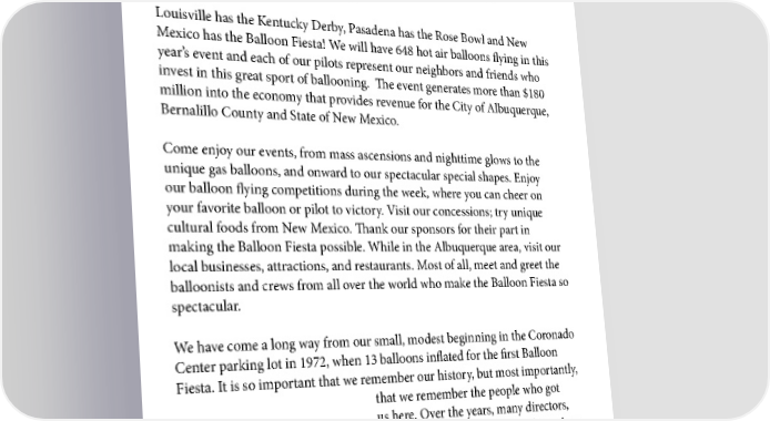 On behalf of the Board of Directors, staff, our hundreds of Navigators (volunteers) and our super staff, it is my great privilege and honor to welcome everyone to the greatest ballooning event in the world. This year, we celebrate a historic milestone, “50 years of Balloon Fiesta,” and we have prepared an exciting and wonderful event for you. Louisville has the Kentucky Derby, Pasadena has the Rose Bowl and New Mexico has the Balloon Fiesta! We will have 648 hot air balloons flying in this year’s event and each of our pilots represent our neighbors and friends who invest in this great sport of ballooning. The event generates more than $180 million into the economy that provides revenue for the City of Albuquerque, Bernalillo County and State of New Mexico. Come enjoy our events, from mass ascensions and nighttime glows to the unique gas balloons, and onward to our spectacular special shapes. Enjoy our balloon flying competitions during the week, where you can cheer on your favorite balloon or pilot to victory. Visit our concessions; try unique cultural foods from New Mexico. Thank our sponsors for their part in making the Balloon Fiesta possible. While in the Albuquerque area, visit our local businesses, attractions, and restaurants. Most of all, meet and greet the balloonists and crews from all over the world who make the Balloon Fiesta so spectacular. We have come a long way from our small, modest beginning in the Coronado Center parking lot in 1972, when 13 balloons inflated for the first Balloon Fiesta. It is so important that we remember our history, but most importantly, that we remember the people who got us here. Over the years, many directors, volunteers, pilots and crews and members of staff have worked tirelessly and selflessly to put on this great event. Please take the time to say “thank you” when you see them for all their efforts and successes. A big ballooning “Thank You” goes out to everyone attending the 50th Albuquerque International Balloon Fiesta powered by ExxonMobil. Again “Welcome and Enjoy.” Al Tetreault President, AIBF 2022 MEDIA GUIDE WELCOME