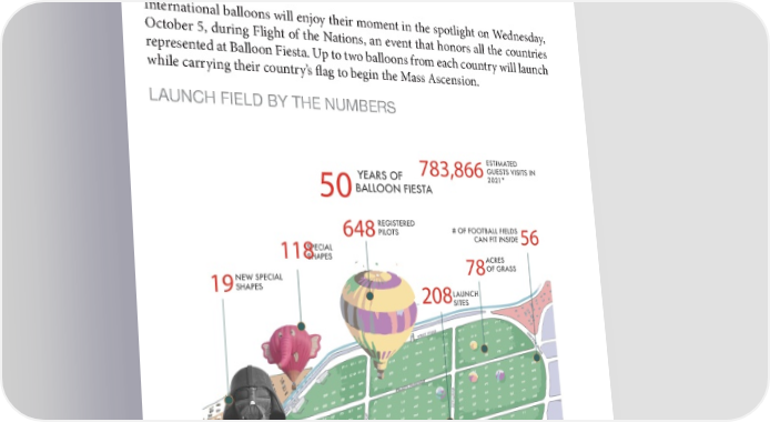 32 Albuquerque International Balloon Fiesta 2022 Media Guide FACTS AND FIGURES 2022 THEME 50th Balloon Fiesta Theme—the 50 h Balloon Fiesta This year’s theme is focused on the 50th event celebration. There is a new theme to Balloon Fiesta every year; the theme is reflected in merchandise, printed and digital artwork. COUNTRIES REPRESENTED There will be 22 countries participating in this year’s Balloon Fiesta including: Austria, Australia, Belgium, Brazil, Canada, Croatia, Czech Republic, France, Germany, Ireland, Italy, Lithuania, Mexico, Netherlands, Poland, Switzerland, Spain, Taiwan (Republic of China), Turkey, Ukraine, United Kingdom, United States. International balloons will enjoy their moment in the spotlight on Wednesday, October 5, during Flight of the Nations, an event that honors all the countries represented at Balloon Fiesta. Up to two balloons from each country will launch while carrying their country’s flag to begin the Mass Ascension. LAUNCH FIELD BY THE NUMBERS