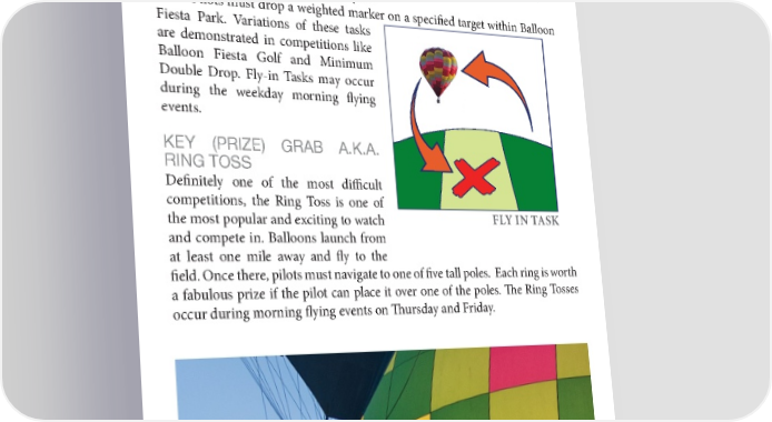 9 Albuquerque International Balloon Fiesta 2022 Media Guide [CONTINUED] HOT AIR BALLOON COMPETITIONS JUDGE DECLARED GOALS A competition where balloon pilots must fly to designated targets at least one mile away from the launch field. This event tests even the best pilots’ skills. Judge Declared Goals may occur during the weekday morning flying events. FLY-IN TASK Ranging from drop heights of only inches to 200 feet above the ground, even the most talented balloon pilots are challenged when it comes to fly-in tasks. Pilots must drop a weighted marker on a specified target within Balloon Fiesta Park. Variations of these tasks are demonstrated in competitions like Balloon Fiesta Golf and Minimum Double Drop. Fly-in Tasks may occur during the weekday morning flying events. KEY (PRIZE) GRAB A .K .A . RING TOSS Definitely one of the most difficult competitions, the Ring Toss is one of the most popular and exciting to watch and compete in. Balloons launch from at least one mile away and fly to the field. Once there, pilots must navigate to one of five tall poles. Each ring is worth a fabulous prize if the pilot can place it over one of the poles. The Ring Tosses occur during morning flying events on Thursday and Friday. FLY IN TASK JUDGE DECLARED GOALS