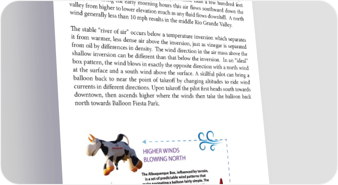 27 Albuquerque International Balloon Fiesta 2022 Media Guide THE SCIENCE OF THE “ALBUQUERQUE BOX” This wind pattern for which the Albuquerque area is well known and occurs under stable conditions during the fall season when no strong weather systems are affecting the area. On days when the “box” occurs, it dissipates by mid- morning as the sun heats the ground, resulting in thermal turbulence which mixes the separate layers of air and eliminating the low-level inversion. During the nighttime hours, the air near the ground surface is cooled by the process of radiational cooling. This process is most efficient with clear skies, low humidity, and light wind. Cooler, and therefore denser air flows downslope to lower elevations along arroyos and river valleys. The cool air that flows through the Rio Grande valley is shallow (generally no more than a few hundred feet in depth). During the early morning hours this air flows southward down the valley from higher to lower elevation much as any fluid flows downhill. A north wind generally less than 10 mph results in the middle Rio Grande Valley. The stable “river of air” occurs below a temperature inversion which separates it from warmer, less dense air above the inversion, just as vinegar is separated from oil by differences in density. The wind direction in the air mass above the shallow inversion can be different than that below the inversion. In an “ideal” box pattern, the wind blows in exactly the opposite direction with a north wind at the surface and a south wind above the surface. A skillful pilot can bring a balloon back to near the point of takeoff by changing altitudes to ride wind currents in different directions. Upon takeoff the pilot first heads south towards downtown, then ascends higher where the winds then take the balloon back north towards Balloon Fiesta Park. BALLOON FIESTA WEATHER