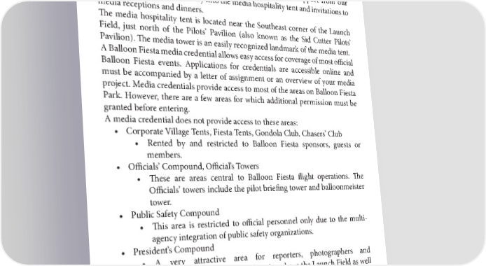 22 Albuquerque International Balloon Fiesta 2022 Media Guide MEDIA ACCESS The Albuquerque International Balloon Fiesta is a regular favorite of local, national, and international media organizations. Over the past five years, more than 36,745 stories have featured the event, our pilots, sponsors, and guests. Media credential applications may be submitted through the Balloon Fiesta website (https://balloonfiesta.com/Media). Media registration for the 2022 event will remain open until September 2022. Applications will be reviewed and approved on a rolling basis. Credentialed media at Balloon Fiesta are provided the opportunity for a hot air balloon ride (based on availability), complimentary parking, event entry, access to a photography tower, wireless internet access, logistical support from our professional media team, entry into the media hospitality tent and invitations to media receptions and dinners. The media hospitality tent is located near the Southeast corner of the Launch Field, just north of the Pilots’ Pavilion (also known as the Sid Cutter Pilots’ Pavilion). The media tower is an easily recognized landmark of the media tent. A Balloon Fiesta media credential allows easy access for coverage of most official Balloon Fiesta events. Applications for credentials are accessible online and must be accompanied by a letter of assignment or an overview of your media project. Media credentials provide access to most of the areas on Balloon Fiesta Park. However, there are a few areas for which additional permission must be granted before entering. A media credential does not provide access to these areas: • Corporate Village Tents, Fiesta Tents, Gondola Club, Chasers’ Club • Rented by and restricted to Balloon Fiesta sponsors, guests or members. • Officials’ Compound, Official’s Towers • These are areas central to Balloon Fiesta flight operations. The Officials’ towers include the pilot briefing tower and balloonmeister tower. • Public Safety Compound • This area is restricted to official personnel only due to the multi- agency integration of public safety organizations. • President’s Compound • A very attractive area for reporters, photographers and videographers because of its location above the Launch Field as well as the accompanying views. Those views also make the area very attractive to the RV guests who rent the area well in advance of the event each year. Limited escorted access to this area is provided by the media team, as available. • Field During Competitions • During all days of flying competitions, access in the competition area requires an official media escort. Requests need to be made in advance and safety vests must also be worn on the field. [CONTINUED]